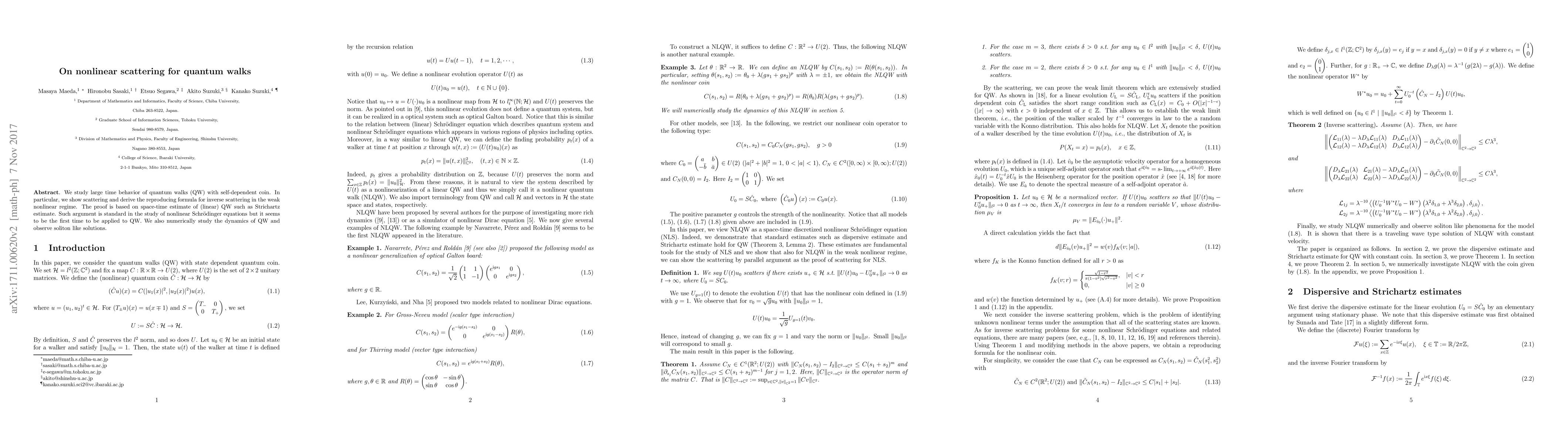 This paper studies the behavior of quantum walks in a nonlinear regime, deriving scattering formulas and observing soliton-like solutions through numerical simulations.
