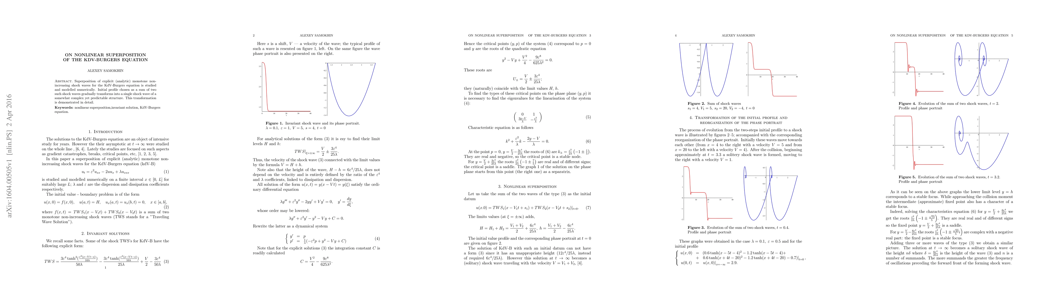 Superposition of explicit (analytic) monotone non-increasing shock waves for the KdV-Burgers equation is studied, modelled numerically and graphically presented. Initial profile chosen as a sum of two such shock waves gradually transforms into a single shock wave of a somewhat complex yet predictable structure. This transformation is demonstrated in detail.