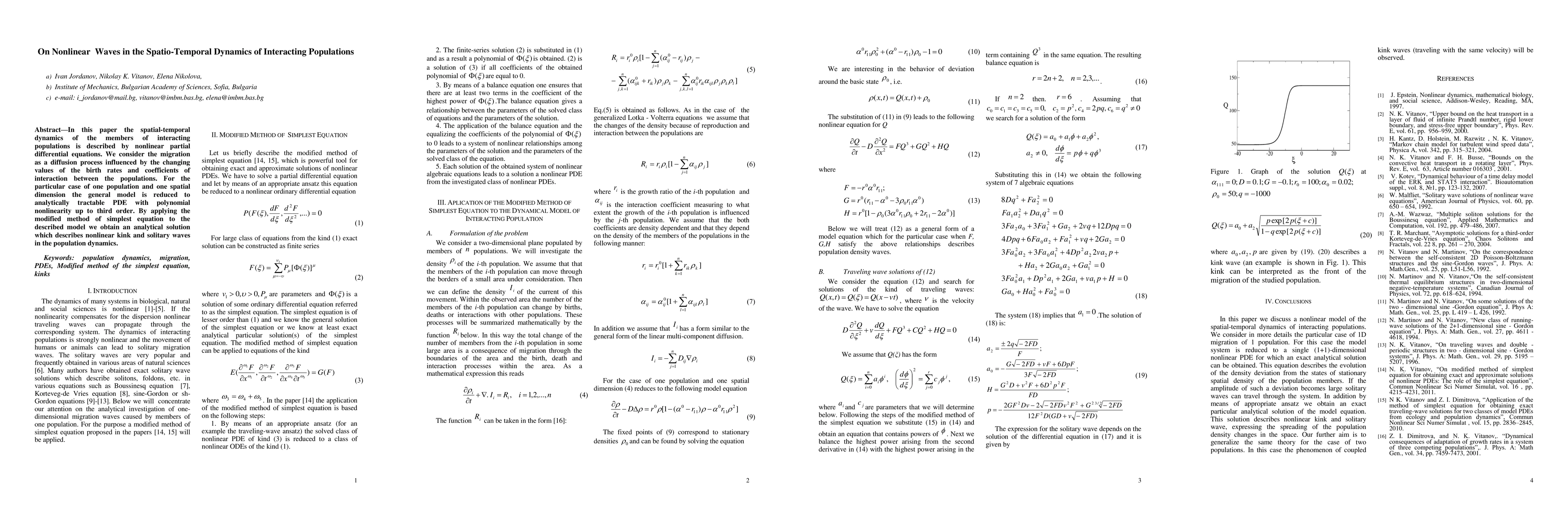 In this paper the spatial-temporal dynamics of the members of interacting populations is described by nonlinear partial differential equations. We consider the migration as a diffusion process influenced by the changing values of the birth rates and coefficients of interaction between the populations. For the particular case of one population and one spatial dimension the general model is reduced to analytically tractable PDE with polynomial nonlinearity up to third order. By applying the modified method of simplest equation to the described model we obtain an analytical solution which describes nonlinear kink and solitary waves in the population dynamics.