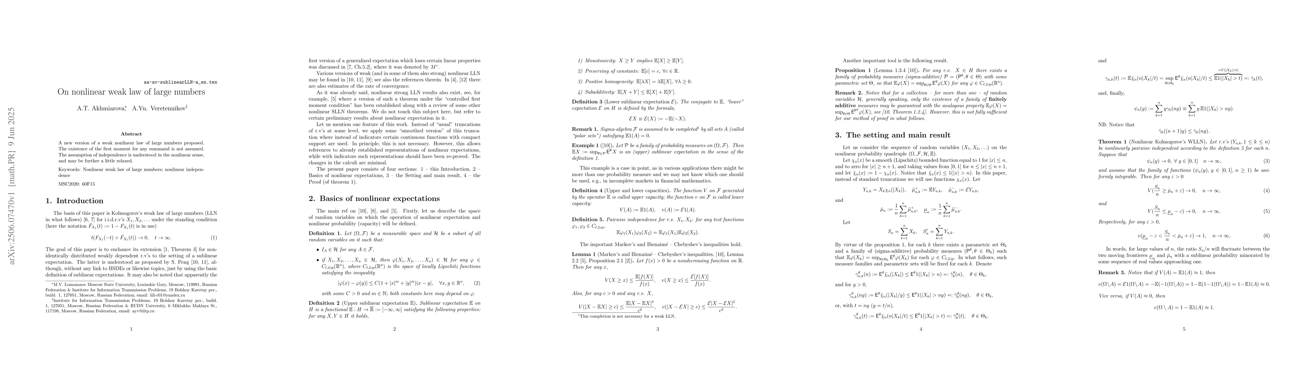 A new version of a weak nonlinear law of large numbers proposed. The existence of the first moment for any summand is not assumed. The assumption of independence is understood in the nonlinear sense, and may be further a little relaxed.