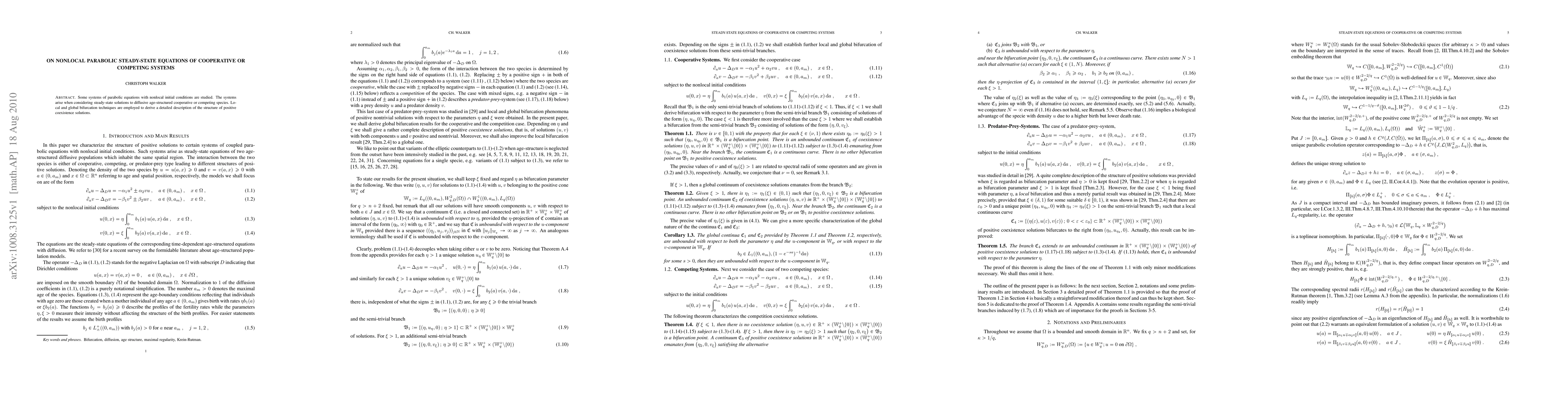 Some systems of parabolic equations with nonlocal initial conditions are studied. The systems arise when considering steady-state solutions to diffusive age-structured cooperative or competing species. Local and global bifurcation techniques are employed to derive a detailed description of the structure of positive coexistence solutions.