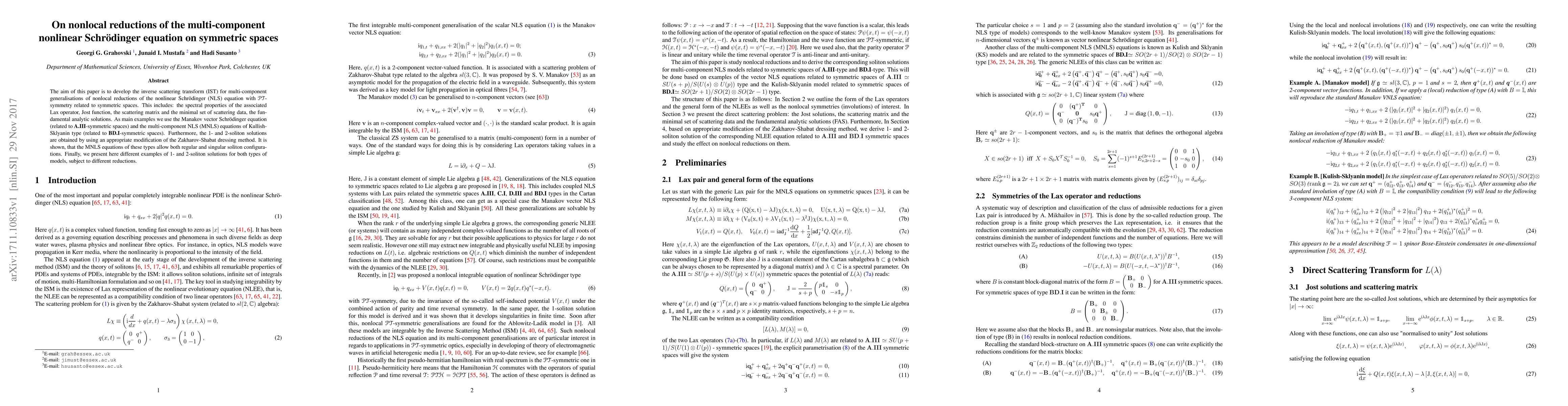 The aim of this paper is to develop the inverse scattering transform (IST) for multi-component generalisations of nonlocal reductions of the nonlinear Schrodinger (NLS) equation with PT-symmetry related to symmetric spaces. This includes: the spectral properties of the associated Lax operator, Jost function, the scattering matrix and the minimal set of scattering data, the fundamental analytic solutions. As main examples, we use the Manakov vector Schr\"odinger equation (related to A.III-symmetric spaces) and the multi-component NLS (MNLS) equations of Kullish-Sklyanin type (related to BD.I-symmetric spaces). Furthermore, the 1- and 2-soliton solutions are obtained by using an appropriate modification of the Zakharov-Shabat dressing method. It is shown, that the MNLS equations of these types allow both regular and singular soliton configurations. Finally, we present here different examples of 1- and 2-soliton solutions for both types of models, subject to different reductions.