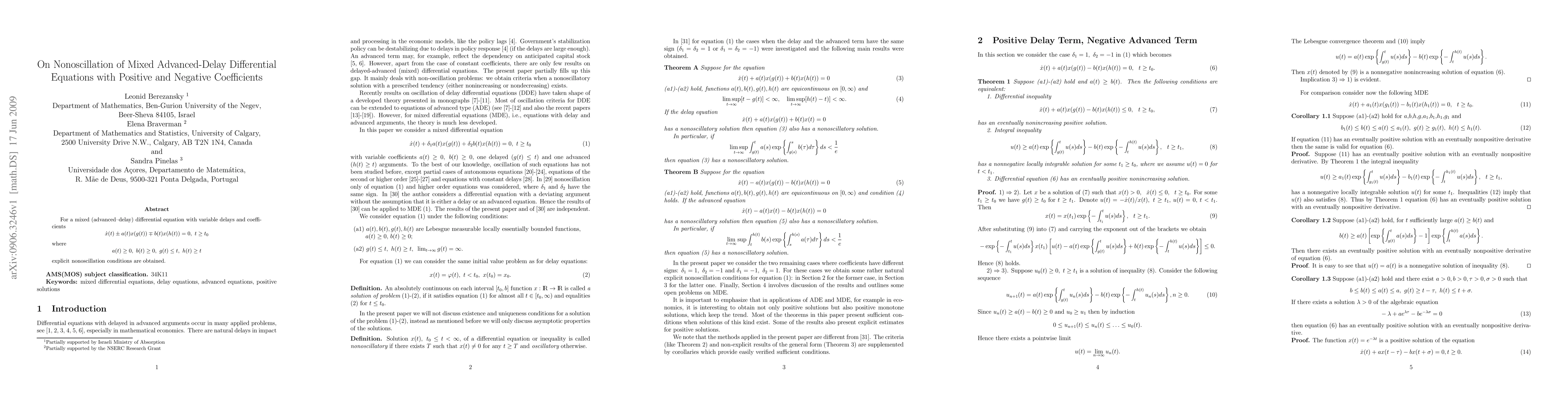 For a mixed (advanced--delay) differential equation with variable delays and coefficients $$ \dot{x}(t) \pm a(t)x(g(t)) \mp b(t)x(h(t)) = 0, t\geq t_0 $$ where $$ a(t)\geq 0, b(t)\geq 0, g(t)\leq t, h(t)\geq t $$ explicit nonoscillation conditions are obtained.