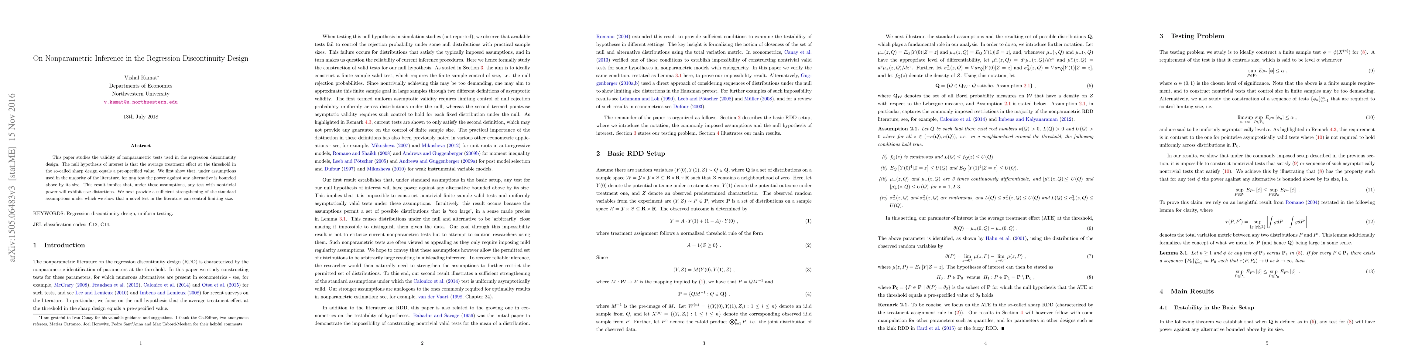 This paper studies the validity of nonparametric tests used in the regression discontinuity design. The null hypothesis of interest is that the average treatment effect at the threshold in the so-called sharp design equals a pre-specified value. We first show that, under assumptions used in the majority of the literature, for \emph{any} test the power against any alternative is bounded above by its size. This result implies that, under these assumptions, any test with nontrivial power will exhibit size distortions. We next provide a sufficient strengthening of the standard assumptions under which we show that a novel test in the literature can control limiting size.