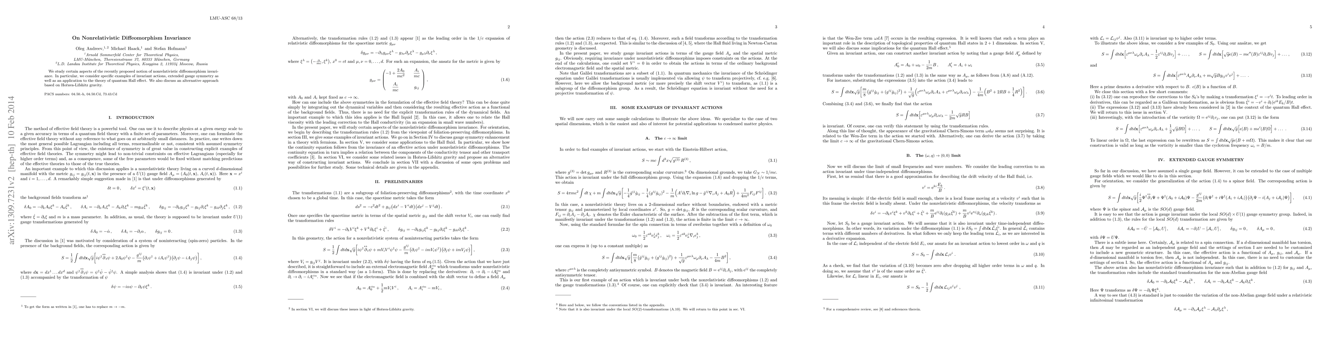 This paper explores nonrelativistic diffeomorphism invariance, examining invariant actions, extended gauge symmetry, and its application to quantum Hall effect theory, alongside an alternative Horava-Lifshitz gravity approach.