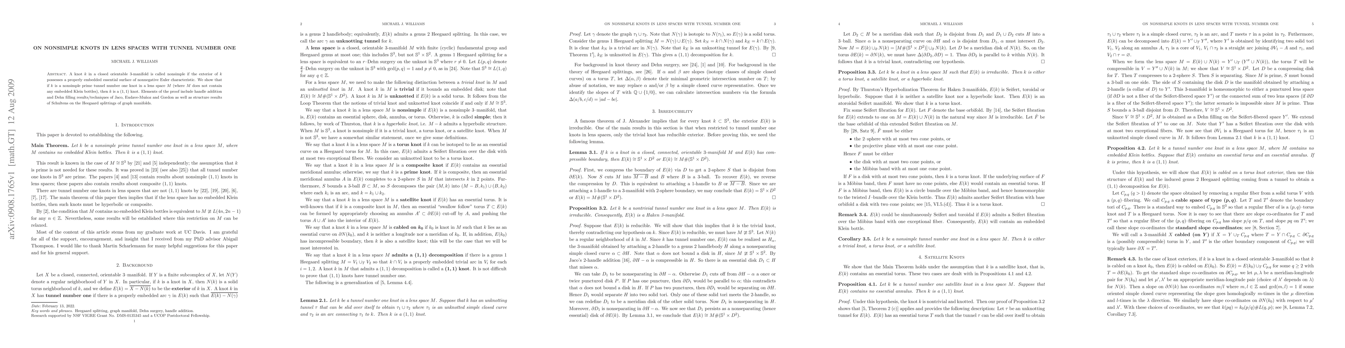 A knot k in a closed orientable 3-manifold is called nonsimple if the exterior of k possesses a properly embedded essential surface of nonnegative Euler characteristic. We show that if k is a nonsimple prime tunnel number one knot in a lens space M (where M does not contain any embedded Klein bottles), then k is a (1,1) knot. Elements of the proof include handle addition and Dehn filling results/techniques of Jaco, Eudave-Munoz and Gordon as well as structure results of Schultens on the Heegaard splittings of graph manifolds.