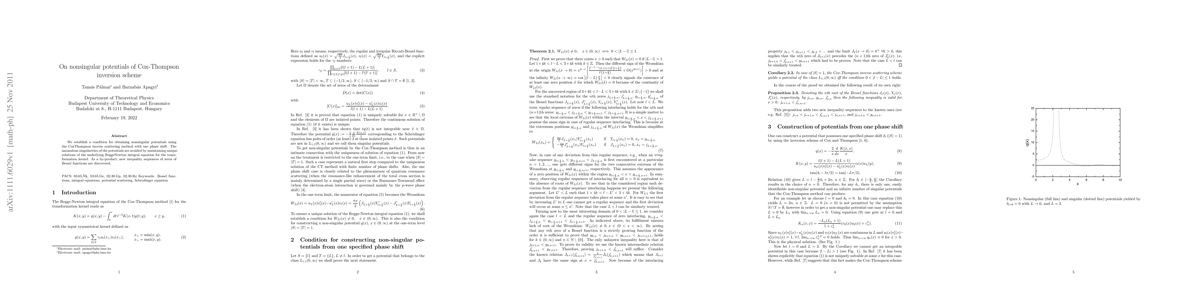 This paper establishes a condition for nonsingular potentials in the Cox-Thompson inversion scheme, avoiding anomalous singularities through unique solutions of the Regge-Newton integral equation. Additionally, it uncovers new inequality sequences related to the zeros of Bessel functions.