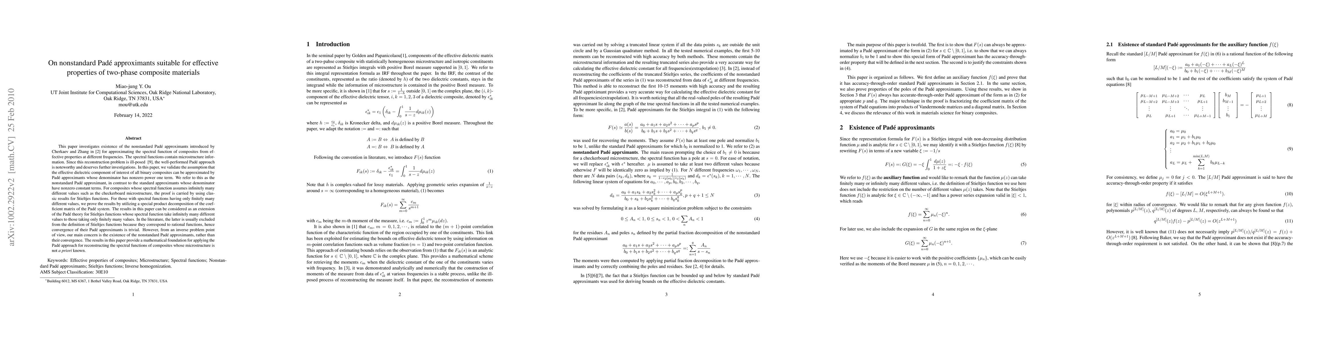 This paper explores the existence of nonstandard Pade approximants introduced by Cherkaev and Zhang for approximating the spectral function of composites, focusing on effective dielectric properties. It extends Pade theory to composites with spectral functions having finitely many values, providing a mathematical foundation for reconstructing composite microstructures.