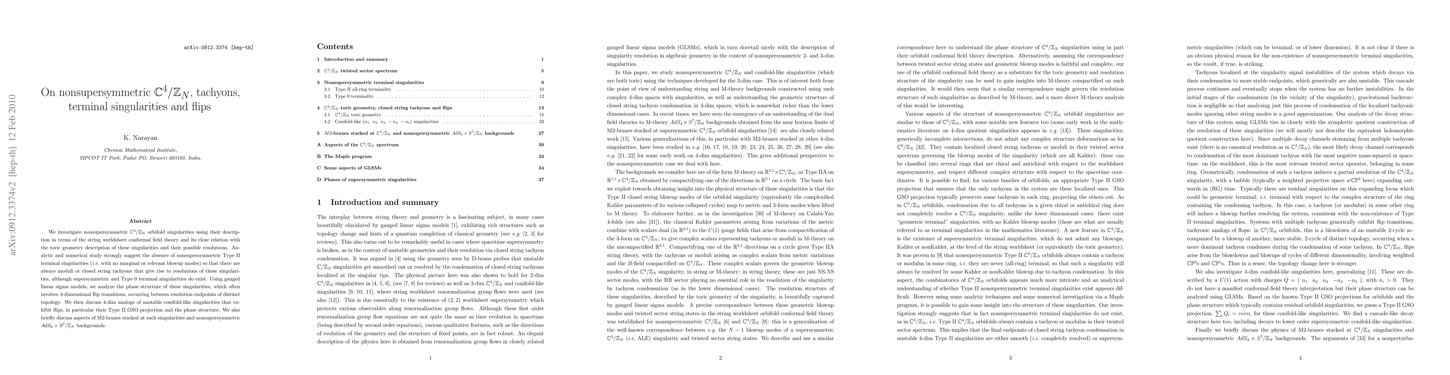 We investigate nonsupersymmetric $\BC^4/\BZ_N$ orbifold singularities using their description in terms of the string worldsheet conformal field theory and its close relation with the toric geometry description of these singularities and their possible resolutions. Analytic and numerical study strongly suggest the absence of nonsupersymmetric Type II terminal singularities (i.e. with no marginal or relevant blowup modes) so that there are always moduli or closed string tachyons that give rise to resolutions of these singularities, although supersymmetric and Type 0 terminal singularities do exist. Using gauged linear sigma models, we analyze the phase structure of these singularities, which often involves 4-dimensional flip transitions, occurring between resolution endpoints of distinct topology. We then discuss 4-dim analogs of unstable conifold-like singularities that exhibit flips, in particular their Type II GSO projection and the phase structure. We also briefly discuss aspects of M2-branes stacked at such singularities and nonsupersymmetric $AdS_4\times S^7/\BZ_N$ backgrounds.