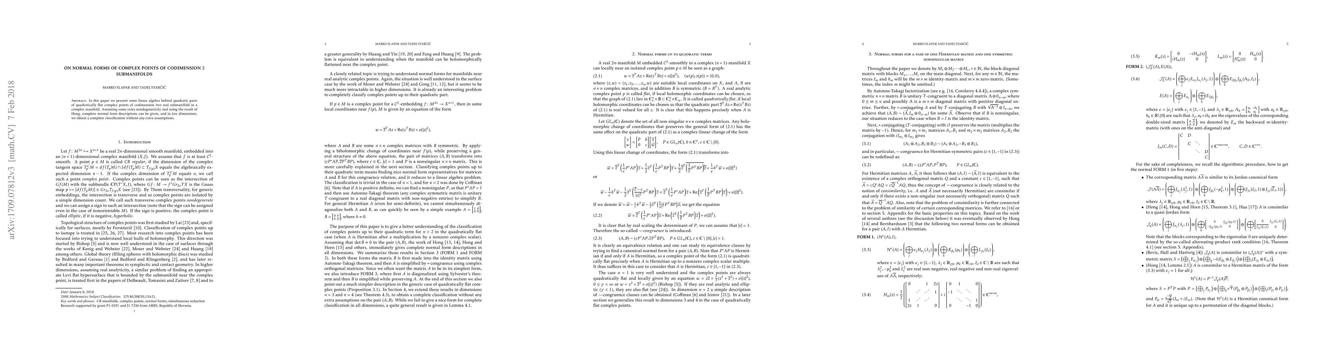 This paper provides linear algebra insights into quadratic components of complex points on codimension two real submanifolds within complex manifolds. It offers complete normal form descriptions under certain conditions, and achieves a full classification in low dimensions without additional assumptions.