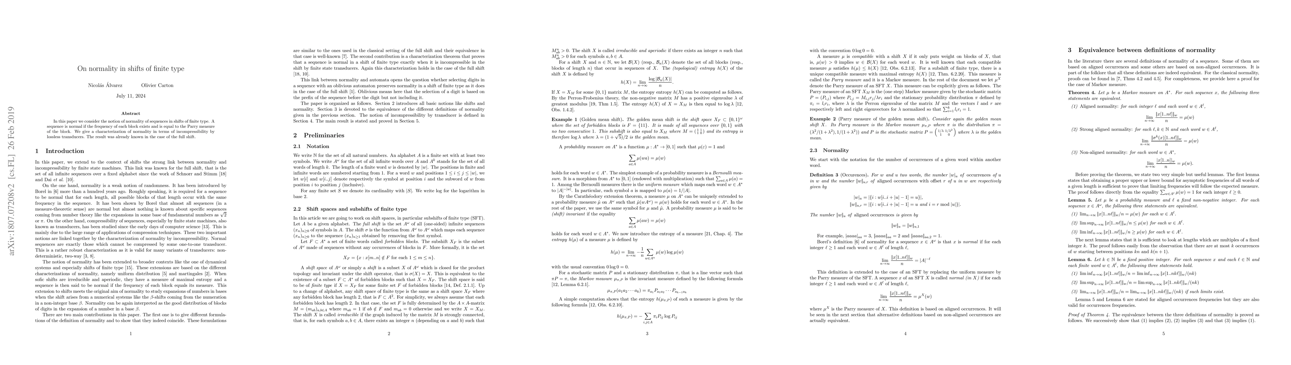 In this paper we consider the notion of normality of sequences in shifts of finite type. A sequence is normal if the frequency of each block exists and is equal to the Parry measure of the block. We give a characterization of normality in terms of incompressibility by lossless transducers. The result was already known in the case of the full shift.