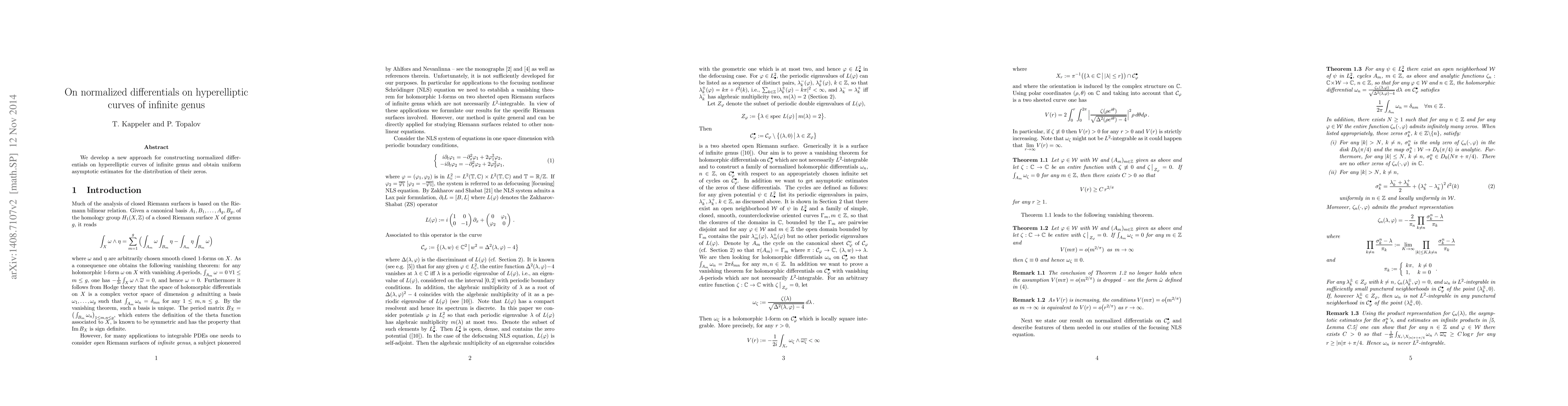 We develop a new approach for constructing normalized differentials on hyperelliptic curves of infinite genus and obtain uniform asymptotic estimates for the distribution of their zeros.