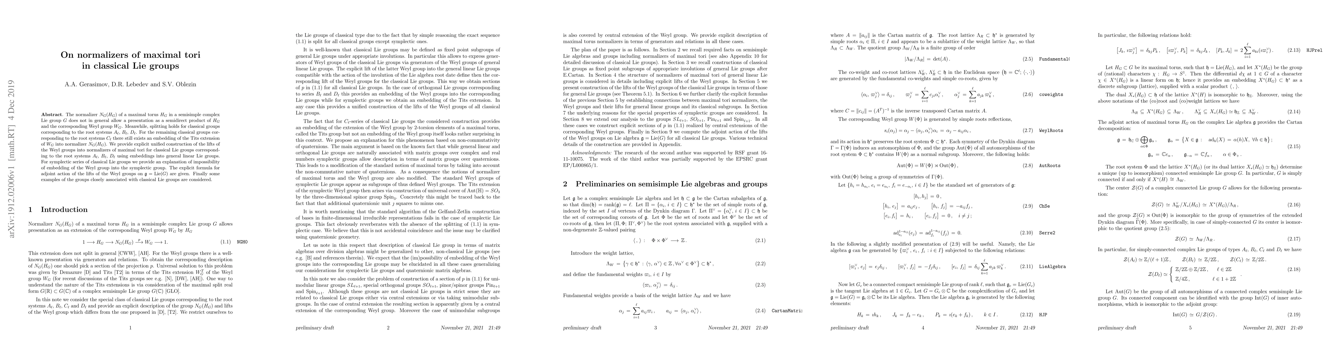 This paper studies the normalizers of maximal tori in classical Lie groups, showing that while they do not generally split as a semidirect product, specific structures hold for classical groups based on root systems $A_\ell$, $B_\ell$, $D_\ell$. It provides explicit constructions for lifting Weyl groups into these normalizers and explains the impossibility of embedding the Weyl group into symplectic groups.