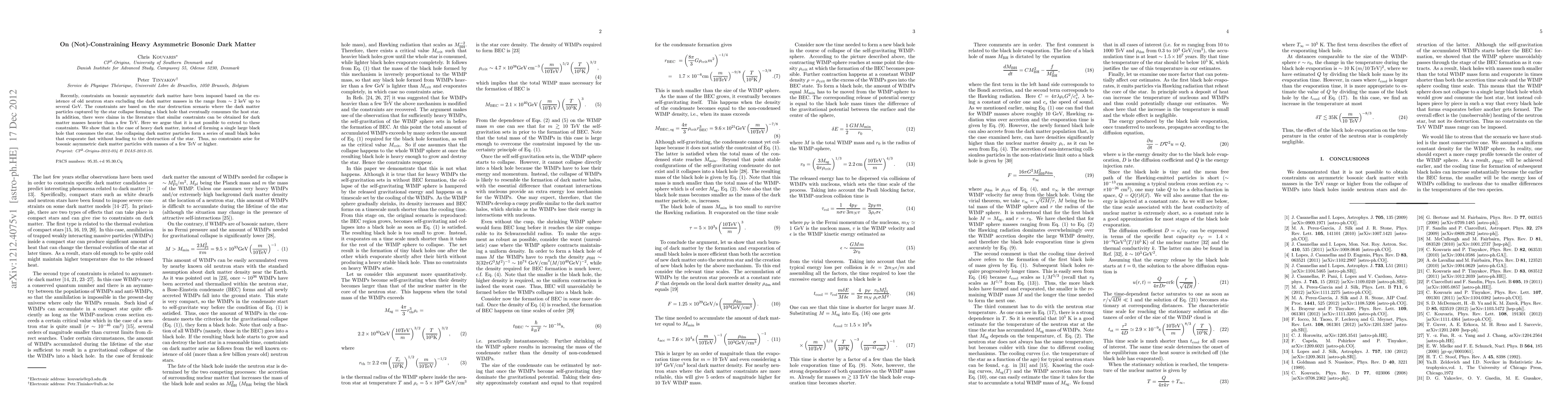 This paper argues that constraints on bosonic asymmetric dark matter based on neutron star destruction do not apply to heavy dark matter masses above a few TeV. Instead of forming a black hole that destroys the star, heavy dark matter particles create small black holes that evaporate quickly, thus avoiding star destruction and lifting constraints for such masses.