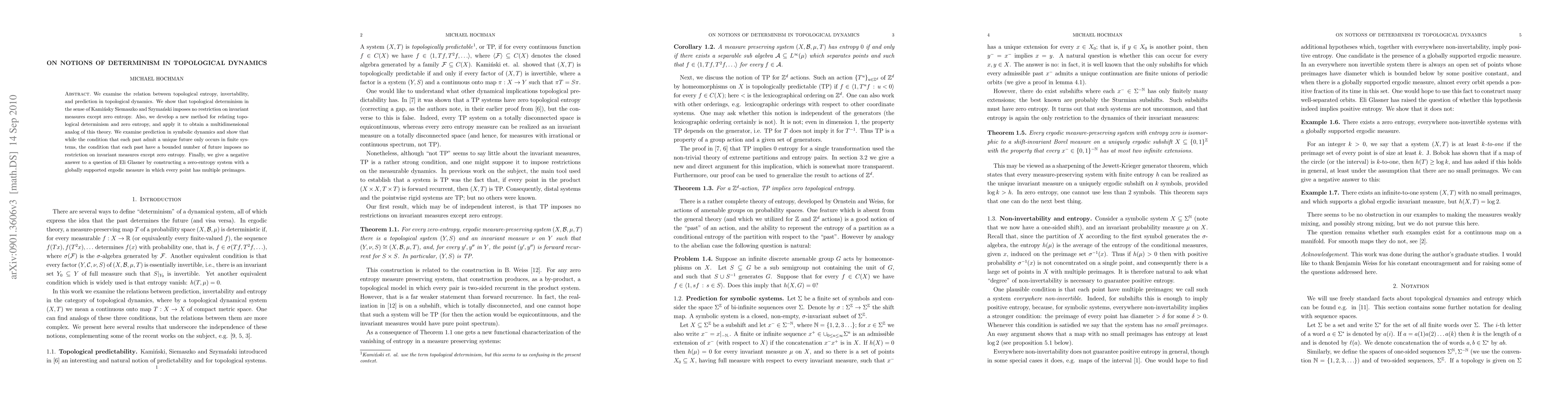 We examine the relation between topological entropy, invertability, and prediction in topological dynamics. We show that topological determinism in the sense of Kamisky Siemaszko and Szymaski imposes no restriction on invariant measures except zero entropy. Also, we develop a new method for relating topological determinism and zero entropy, and apply it to obtain a multidimensional analog of this theory. We examine prediction in symbolic dynamics and show that while the condition that each past admit a unique future only occurs in finite systems, the condition that each past have a bounded number of future imposes no restriction on invariant measures except zero entropy. Finally, we give a negative answer to a question of Eli Glasner by constructing a zero-entropy system with a globally supported ergodic measure in which every point has multiple preimages.