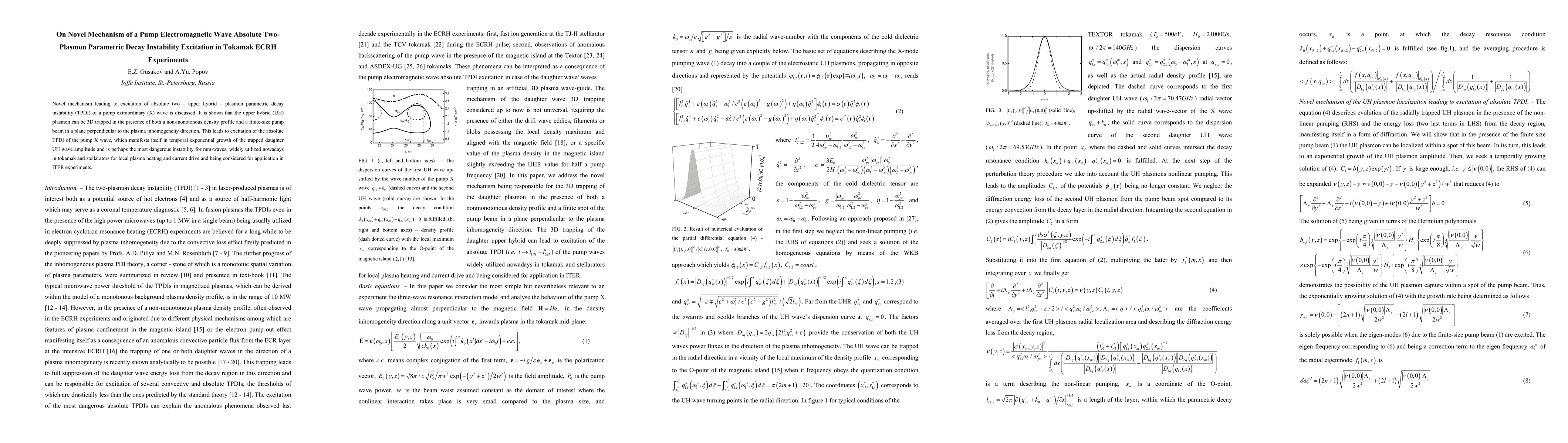 This paper explores a novel mechanism for the excitation of absolute two-plasmon parametric decay instability in tokamak experiments using electron cyclotron resonance heating (ECRH). It demonstrates that the upper hybrid plasmon can be three-dimensionally trapped under nonmonotonous density profiles and finite-size pump beams, leading to significant instability growth in mm-wave applications for plasma heating and current drive.