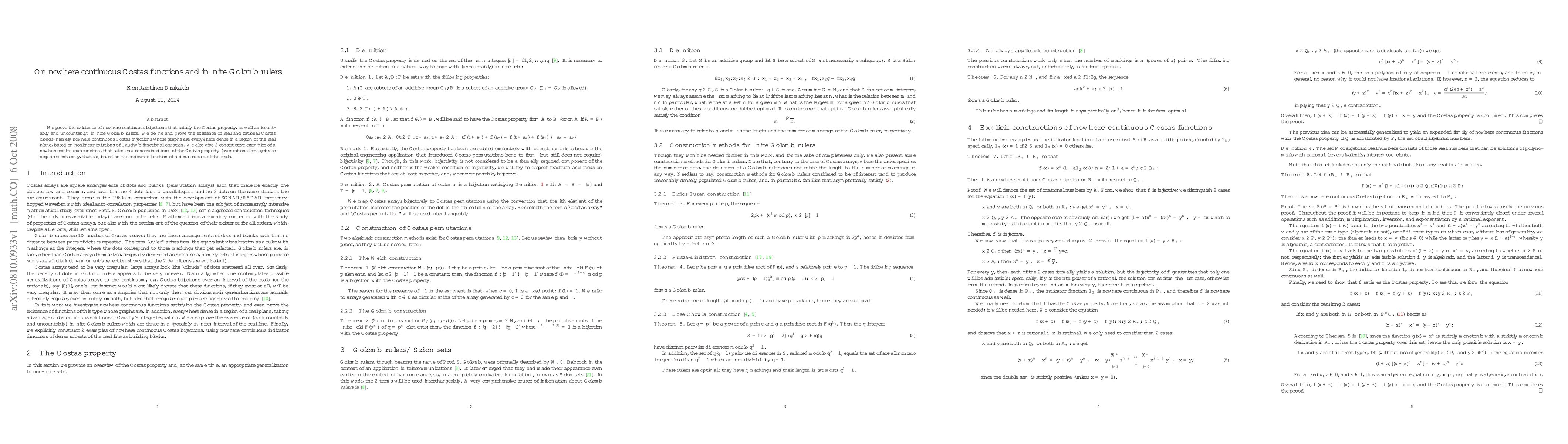 Researchers prove the existence of nowhere continuous functions that satisfy the Costas property and infinite Golomb rulers, with applications in coding theory and combinatorics.
