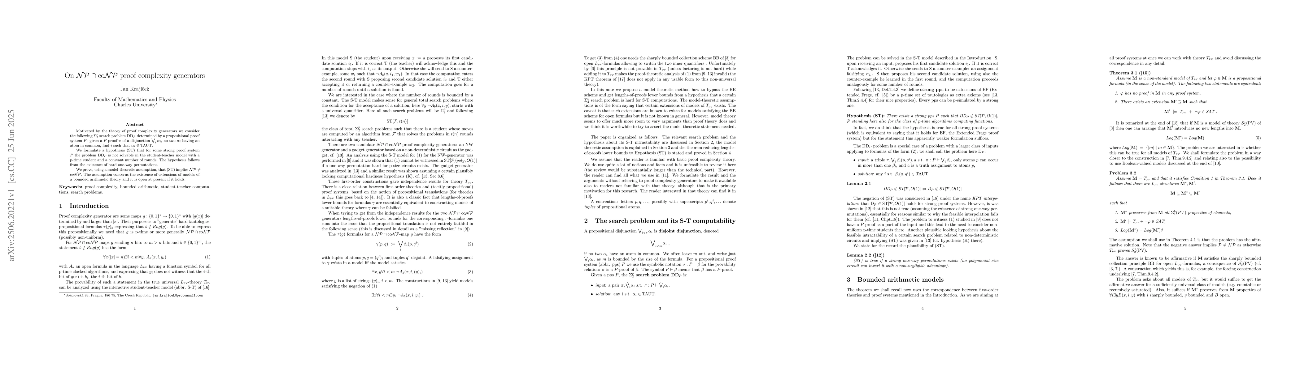Motivated by the theory of proof complexity generators we consider the following $\Sigma^p_2$ search problem $\mbox{DD}_P$ determined by a propositional proof system $P$: given a $P$-proof $\pi$ of a disjunction $\bigvee_i \alpha_i$, no two $\alpha_i$ having an atom in common, find $i$ such that $\alpha_i \in \mbox{TAUT}$. We formulate a hypothesis (ST) that for some strong proof system $P$ the problem $\mbox{DD}_P$ is not solvable in the student-teacher model with a p-time student and a constant number of rounds. The hypothesis follows from the existence of hard one-way permutations. We prove, using a model-theoretic assumption, that (ST) implies $NP \neq coNP$. The assumption concerns the existence of extensions of models of a bounded arithmetic theory and it is open at present if it holds.