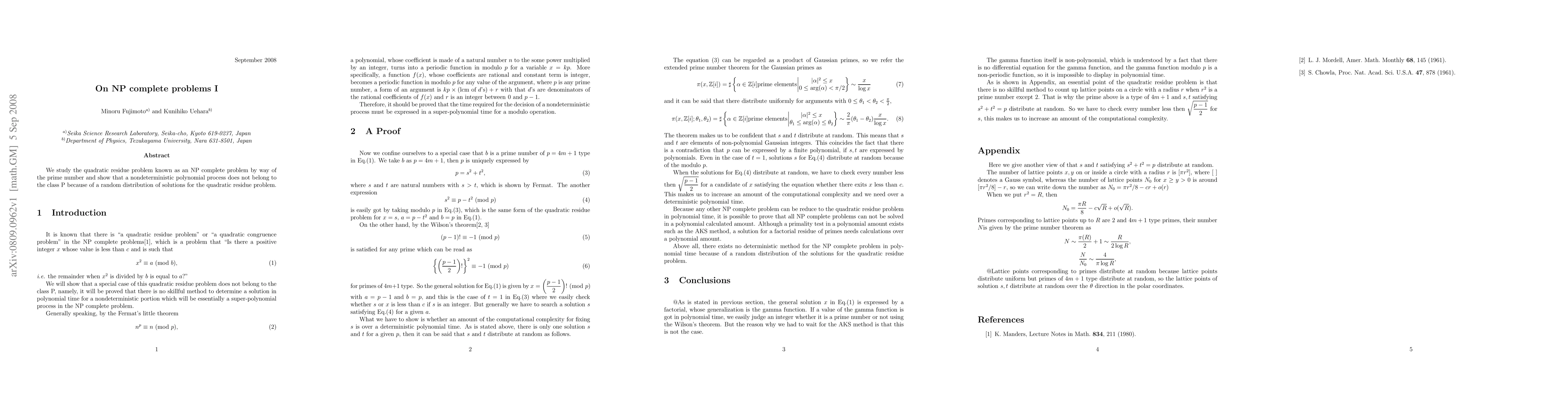 We study the quadratic residue problem known as an NP complete problem by way of the prime number and show that a nondeterministic polynomial process does not belong to the class P because of a random distribution of solutions for the quadratic residue problem.