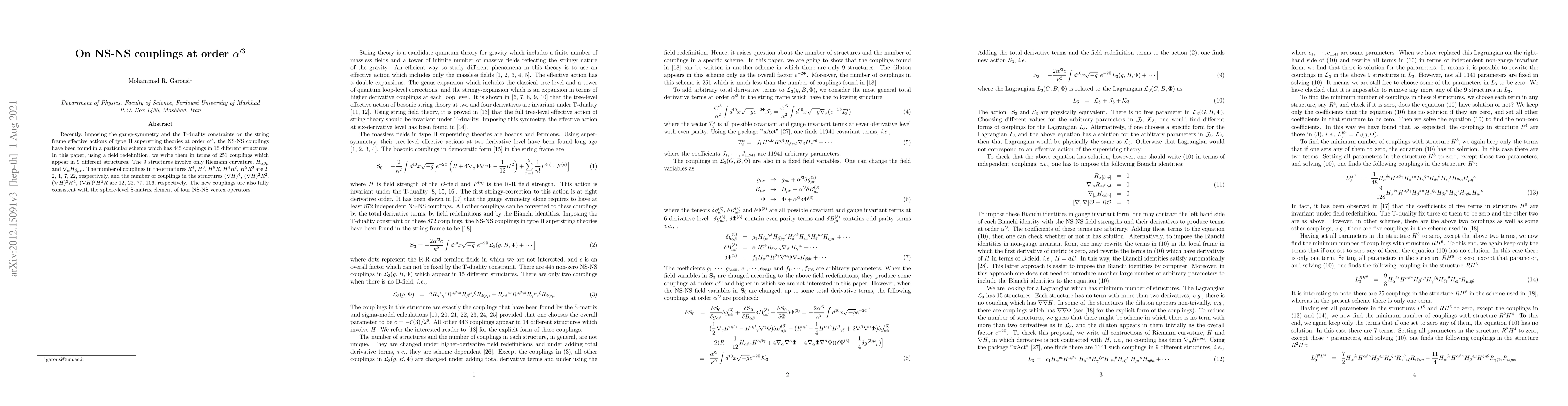 The paper presents a systematic method to reduce the number of NS-NS couplings at order $\alpha'^3$ using field redefinitions and constraints, resulting in a more concise set of 251 couplings.