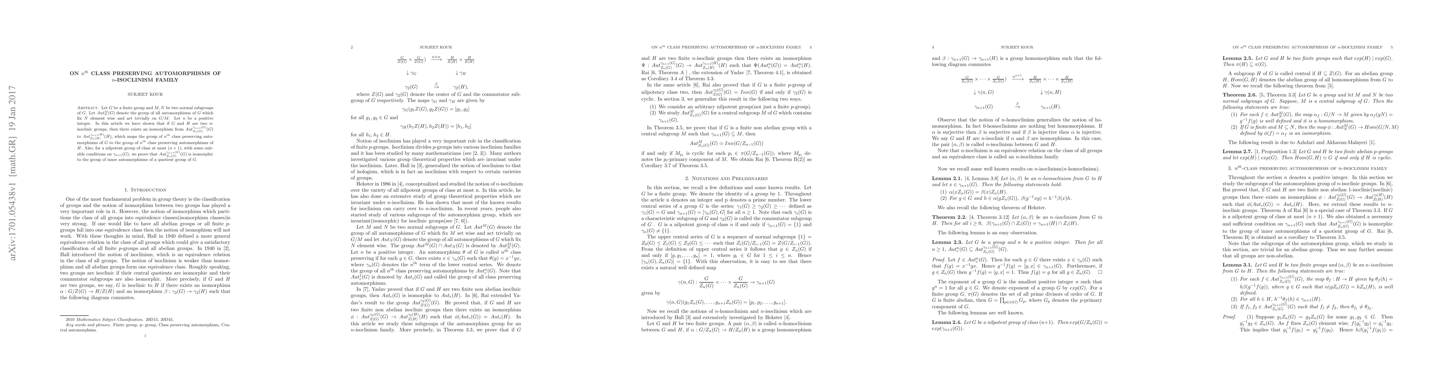 Let $G$ be a finite group and $M,N$ be two normal subgroups of $G$. Let $Aut_N^M(G)$ denote the group of all automorphisms of $G$ which fix $N$ element wise and act trivially on $G/M$. Let $n$ be a positive integer. In this article we have shown that if $G$ and $H$ are two $n$-isoclinic groups, then there exists an isomorphism from $Aut_{Z_n(G)}^{\gamma_{n+1}(G)}(G)$ to $Aut_{Z_n(H)}^{\gamma_{n+1}(H)}(H)$, which maps the group of $n^{th}$ class preserving automorphisms of $G$ to the group of $n^{th}$ class preserving automorphisms of $H$. Also, for a nilpotent group of class at most $(n+1)$, with some suitable conditions on $\gamma_{n+1}(G)$, we prove that $Aut_{Z_n(G)}^{\gamma_{n+1}(G)}(G)$ is isomorphic to the group of inner automorphisms of a quotient group of $G$.