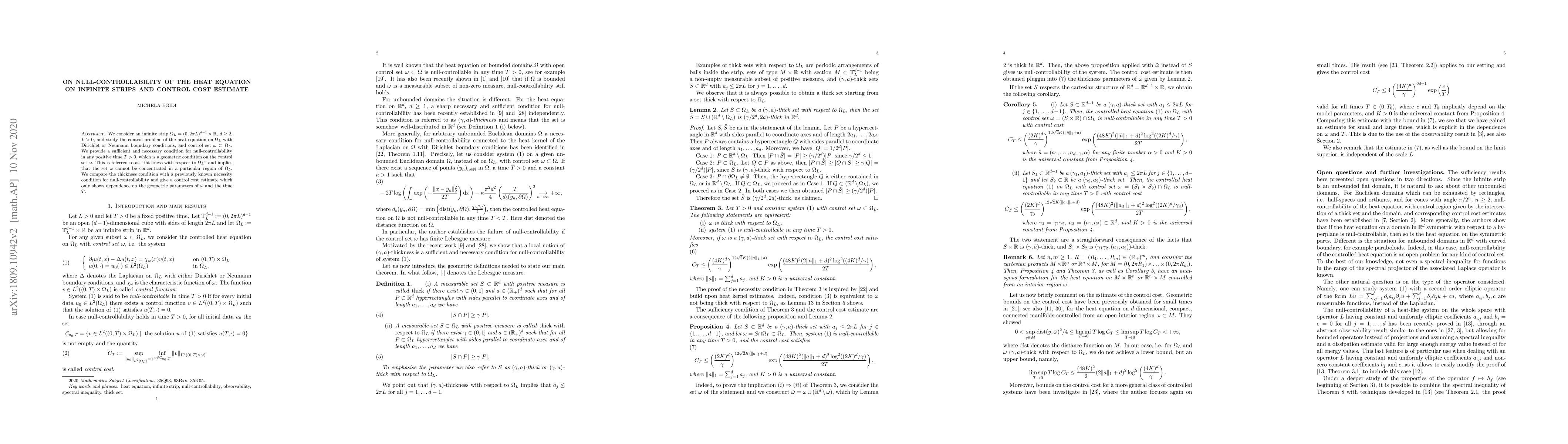 This paper studies the null-controllability of the heat equation on infinite strips, providing a geometric condition termed "thickness with respect to $\Omega_L$" for controllability. It also estimates control costs depending on the geometric parameters of the control set and the time.