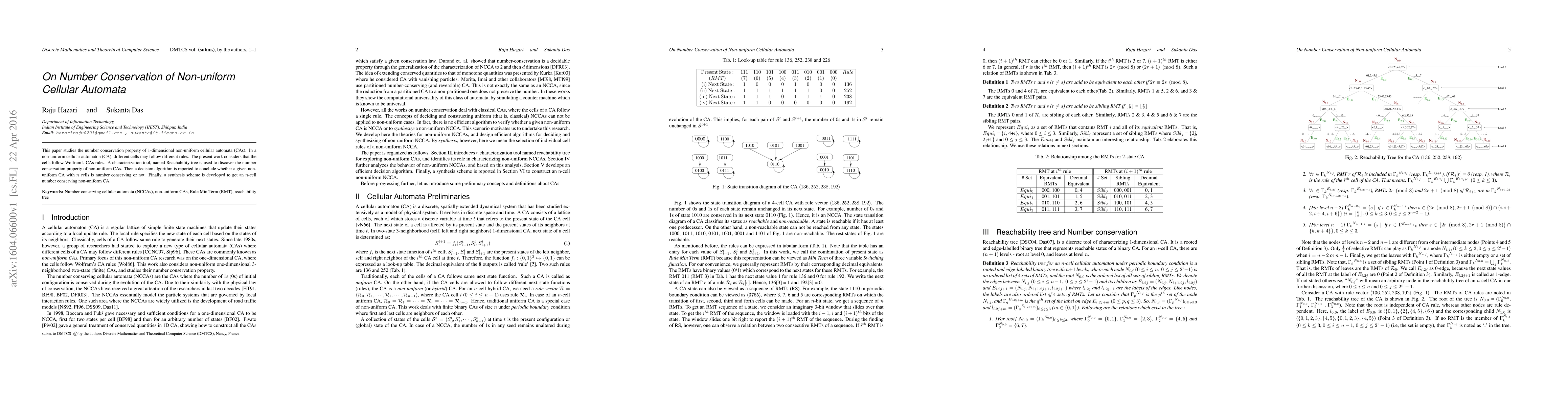 This paper explores the number conservation property in 1-dimensional non-uniform cellular automata where cells follow different rules, employing a Reachability tree for analysis and proposing a decision algorithm to determine if a given CA is number conserving, along with a synthesis method to construct such CAs.