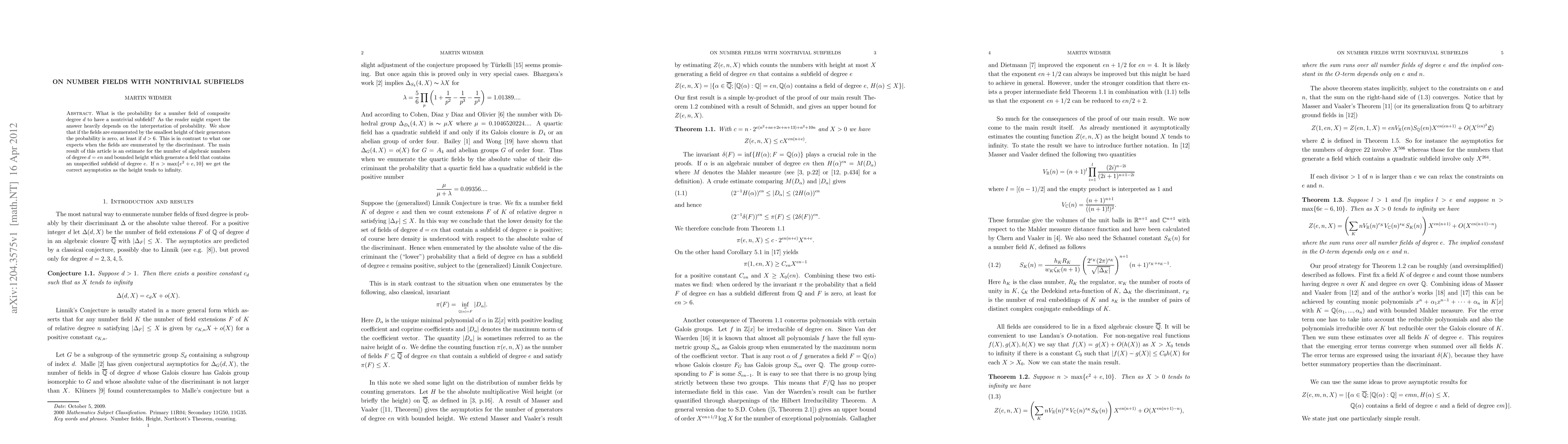 What is the probability for a number field of composite degree $d$ to have a nontrivial subfield? As the reader might expect the answer heavily depends on the interpretation of probability. We show that if the fields are enumerated by the smallest height of their generators the probability is zero, at least if $d>6$. This is in contrast to what one expects when the fields are enumerated by the discriminant. The main result of this article is an estimate for the number of algebraic numbers of degree $d=e n$ and bounded height which generate a field that contains an unspecified subfield of degree $e$. If $n>\max\{e^2+e,10\}$ we get the correct asymptotics as the height tends to infinity.