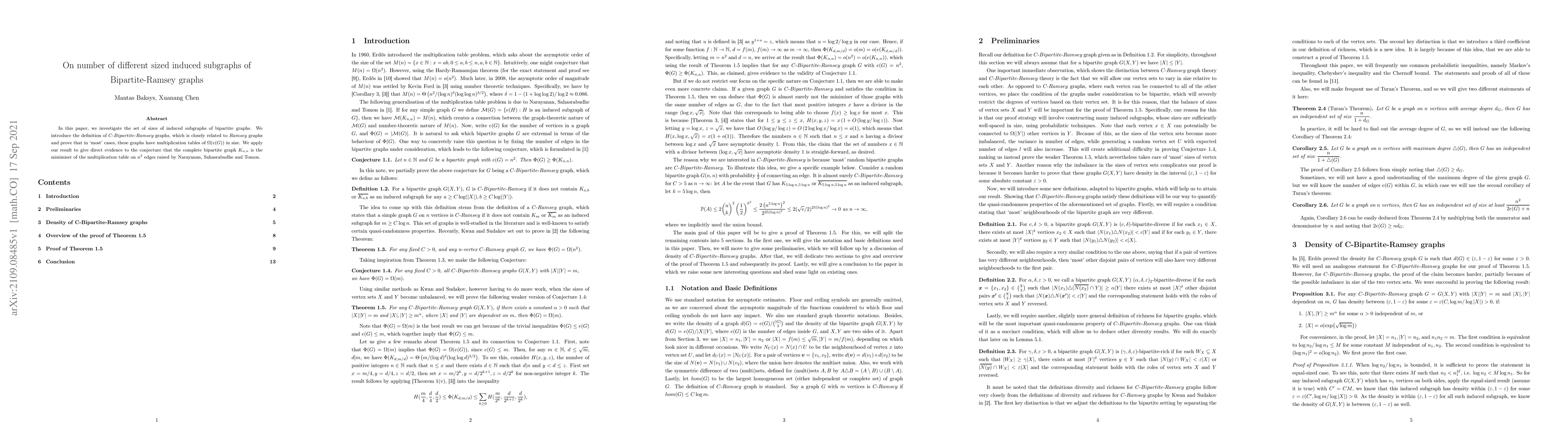 In this paper, we investigate the set of sizes of induced subgraphs of bipartite graphs. We introduce the definition of $C$-$Bipartite$-$Ramsey$ graphs, which is closely related to Ramsey graphs and prove that in `most' cases, these graphs have multiplication tables of $\Omega(e(G))$ in size. We apply our result to give direct evidence to the conjecture that the complete bipartite graph $K_{n,n}$ is the minimiser of the multiplication table on $n^2$ edges raised by Narayanan, Sahasrabudhe and Tomon.