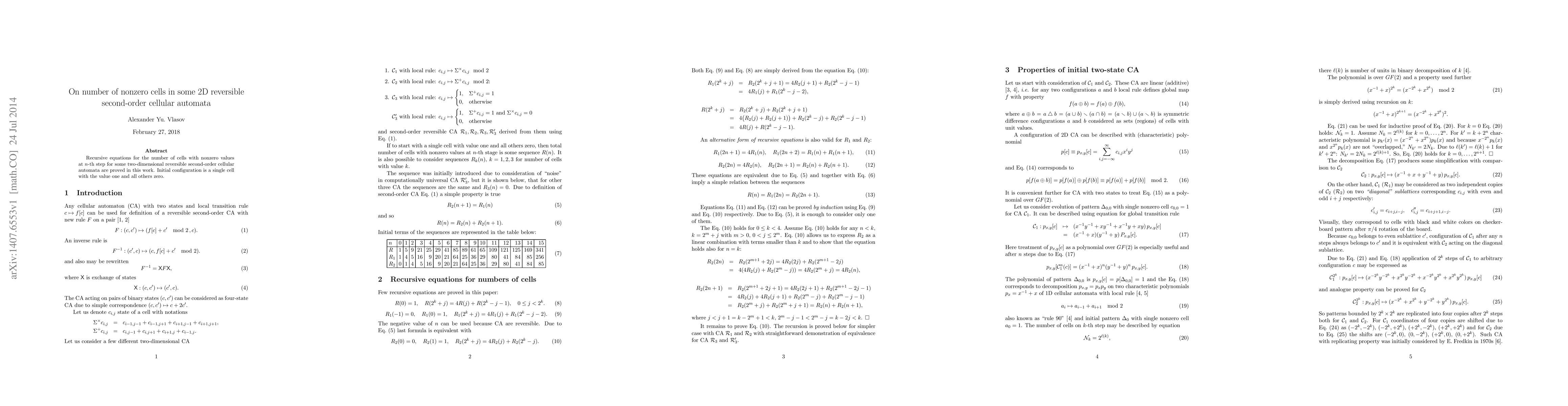 This research derives recursive equations for the number of nonzero cells in certain two-dimensional reversible second-order cellular automata, starting with an initial configuration of a single cell with value one and all others zero.