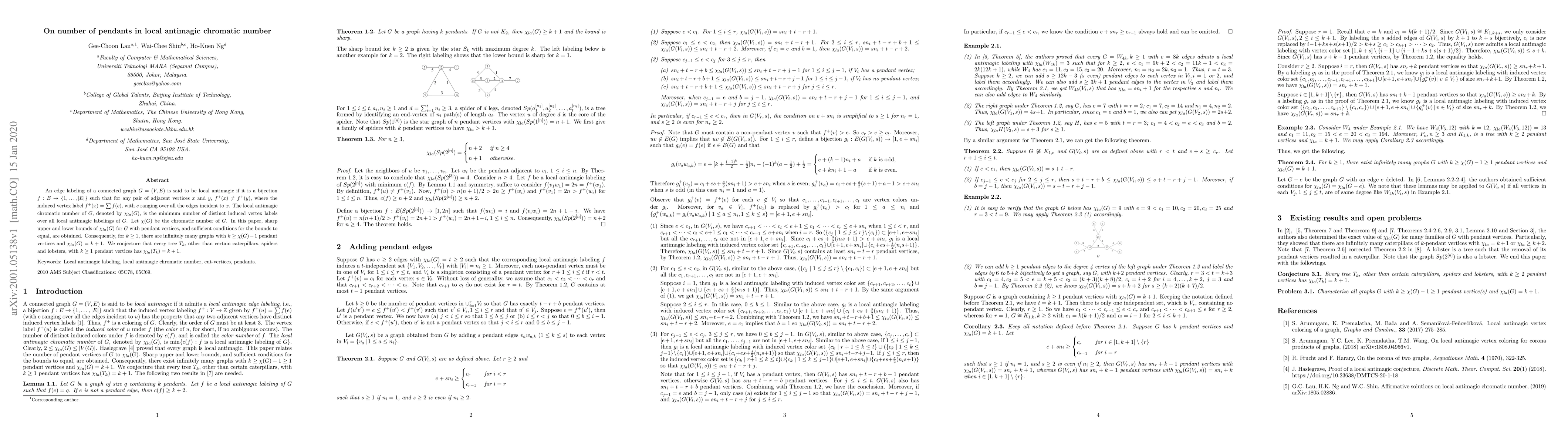 An edge labeling of a connected graph $G = (V, E)$ is said to be local antimagic if it is a bijection $f:E \to\{1,\ldots ,|E|\}$ such that for any pair of adjacent vertices $x$ and $y$, $f^+(x)\not= f^+(y)$, where the induced vertex label $f^+(x)= \sum f(e)$, with $e$ ranging over all the edges incident to $x$. The local antimagic chromatic number of $G$, denoted by $\chi_{la}(G)$, is the minimum number of distinct induced vertex labels over all local antimagic labelings of $G$. Let $\chi(G)$ be the chromatic number of $G$. In this paper, sharp upper and lower bounds of $\chi_{la}(G)$ for $G$ with pendant vertices, and sufficient conditions for the bounds to equal, are obtained. Consequently, for $k\ge 1$, there are infinitely many graphs with $k \ge \chi(G) - 1$ pendant vertices and $\chi_{la}(G) = k+1$. We conjecture that every tree $T_k$, other than certain caterpillars, spiders and lobsters, with $k\ge 1$ pendant vertices has $\chi_{la}(T_k) = k+1$.