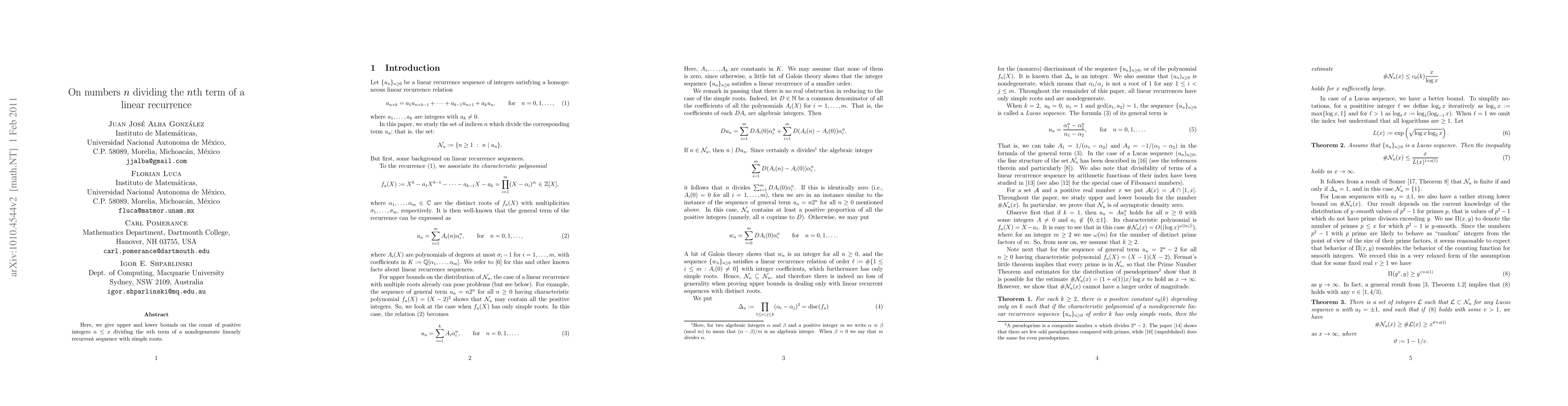 This paper provides upper and lower bounds for the count of integers $n \leq x$ that divide the $n$th term of a nondegenerate linear recurrence sequence with simple roots. The study focuses on the distribution properties of these divisors within a specified range.