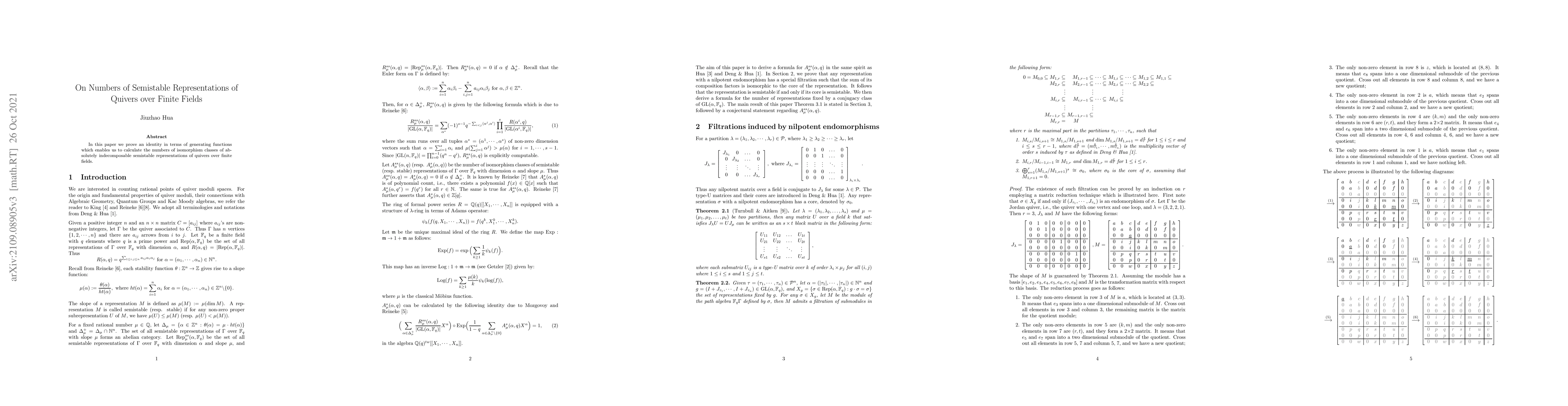 The paper proves an identity using generating functions to calculate numbers of isomorphism classes of absolutely indecomposable semistable representations of quivers over finite fields.