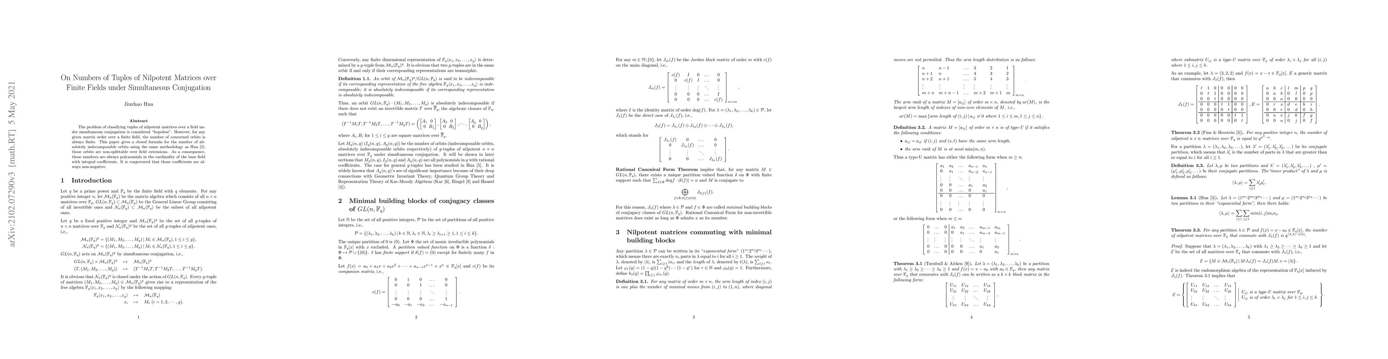 This paper derives a closed formula for the finite number of orbits of tuples of nilpotent matrices over finite fields under simultaneous conjugation, showing they are polynomials in the field's cardinality with integral coefficients. The conjecture is that these coefficients are always non-negative.