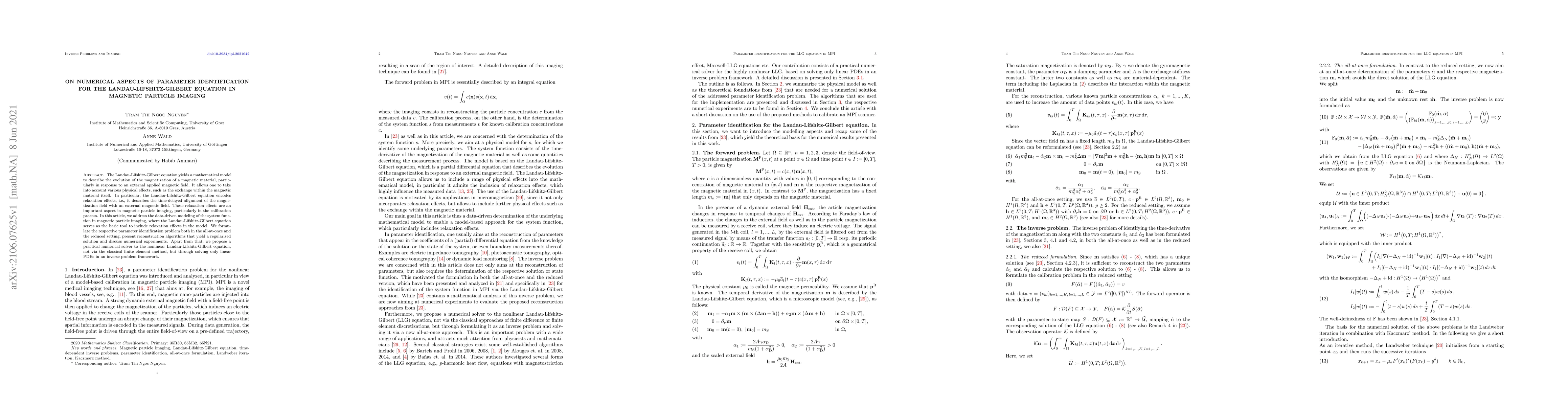 This paper investigates numerical methods for parameter identification in the Landau-Lifshitz-Gilbert equation, which models magnetization evolution in magnetic particle imaging. It proposes a novel solver for the equation, avoiding traditional finite element methods, and discusses reconstruction algorithms for the system function.