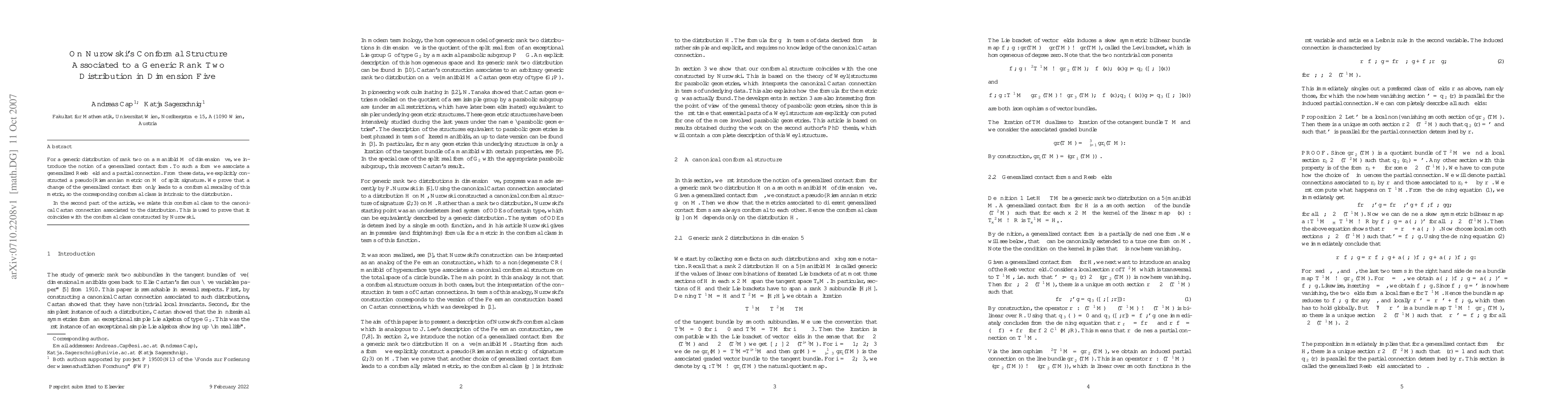 For a generic distribution of rank two on a manifold $M$ of dimension five, we introduce the notion of a generalized contact form. To such a form we associate a generalized Reeb field and a partial connection. From these data, we explicitly constructed a pseudo--Riemannian metric on $M$ of split signature. We prove that a change of the generalized contact form only leads to a conformal rescaling of this metric, so the corresponding conformal class is intrinsic to the distribution. In the second part of the article, we relate this conformal class to the canonical Cartan connection associated to the distribution. This is used to prove that it coincides with the conformal class constructed by Nurowski.