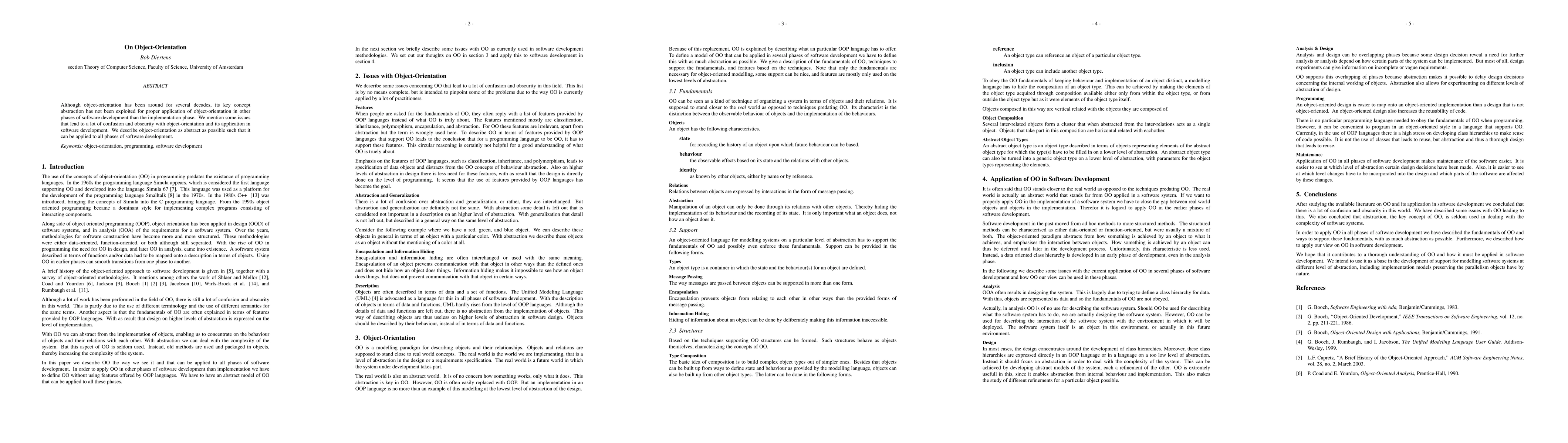 This paper explores object-orientation in software development beyond implementation phase, identifying issues and proposing a more abstract approach to apply it across all phases.