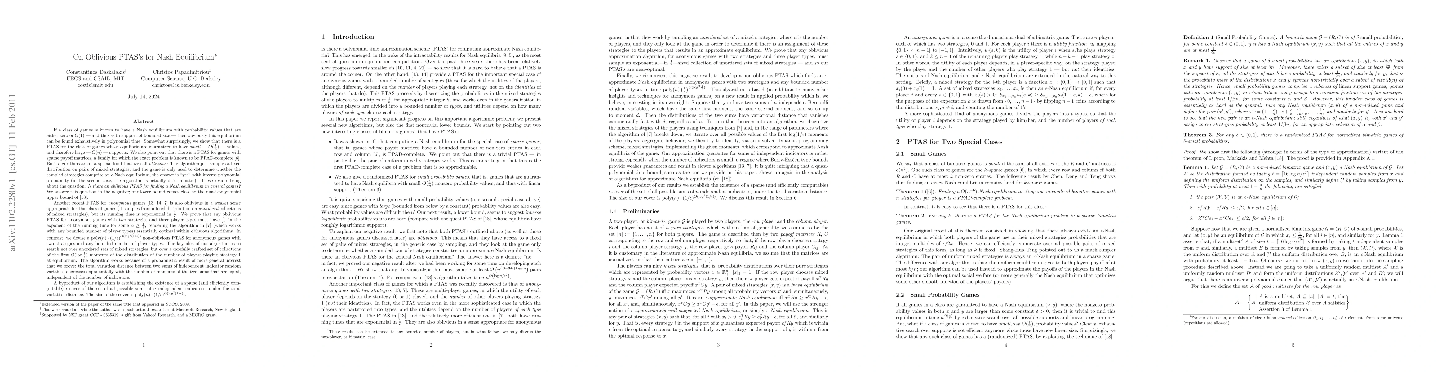 If a game has a Nash equilibrium with probability values that are either zero or Omega(1) then this equilibrium can be found exhaustively in polynomial time. Somewhat surprisingly, we show that there is a PTAS for the games whose equilibria are guaranteed to have small-O(1/n)-values, and therefore large-Omega(n)-supports. We also point out that there is a PTAS for games with sparse payoff matrices, which are known to be PPAD-complete to solve exactly. Both algorithms are of a special kind that we call oblivious: The algorithm just samples a fixed distribution on pairs of mixed strategies, and the game is only used to determine whether the sampled strategies comprise an eps-Nash equilibrium; the answer is yes with inverse polynomial probability. These results bring about the question: Is there an oblivious PTAS for Nash equilibrium in general games? We answer this question in the negative; our lower bound comes close to the quasi-polynomial upper bound of [Lipton, Markakis, Mehta 2003]. Another recent PTAS for anonymous games is also oblivious in a weaker sense appropriate for this class of games (it samples from a fixed distribution on unordered collections of mixed strategies), but its runtime is exponential in 1/eps. We prove that any oblivious PTAS for anonymous games with two strategies and three player types must have 1/eps^c in the exponent of the running time for some c>1/3, rendering the algorithm in [Daskalakis 2008] essentially optimal within oblivious algorithms. In contrast, we devise a poly(n) (1/eps)^O(log^2(1/eps)) non-oblivious PTAS for anonymous games with 2 strategies and any bounded number of player types. Our algorithm is based on the construction of a sparse (and efficiently computable) eps-cover of the set of all possible sums of n independent indicators, under the total variation distance. The size of the cover is poly(n) (1/ eps^{O(log^2 (1/eps))}.