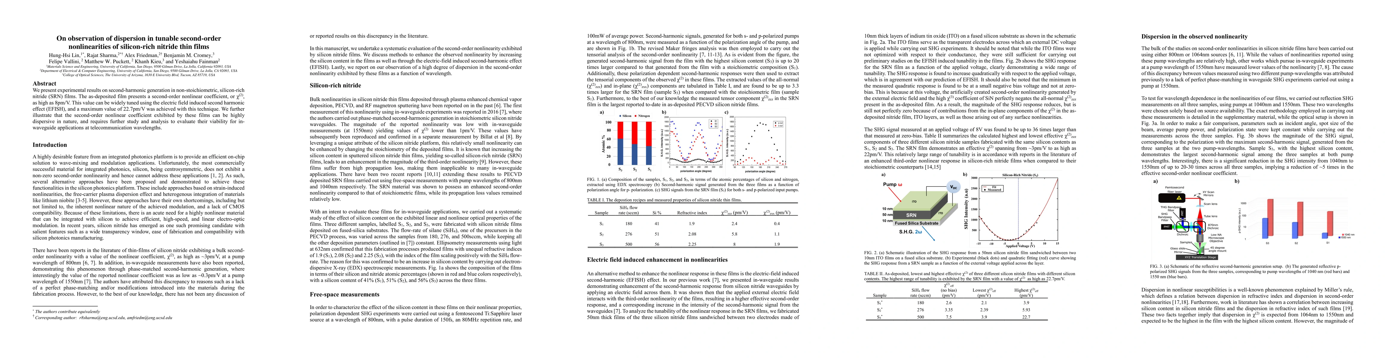 The research demonstrates that silicon-rich nitride films can have a second-order nonlinear coefficient (c{hi}(2)) tuned from 8pm/V to 22.7pm/V using electric field induced second harmonic effect (EFISH). The dispersive nature of this coefficient, requiring further study for waveguide applications at telecommunication wavelengths, is also highlighted.