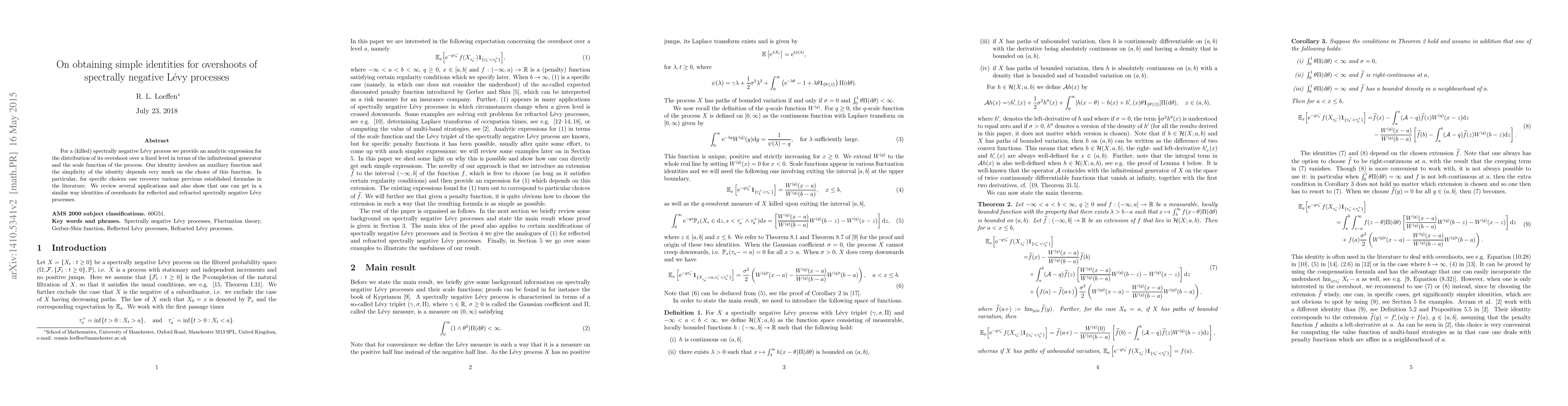 This paper derives an analytic expression for the distribution of overshoots of spectrally negative Lévy processes, using the infinitesimal generator and scale function. The simplicity of the resulting identity varies with the choice of an auxiliary function, recovering established formulas for specific choices.