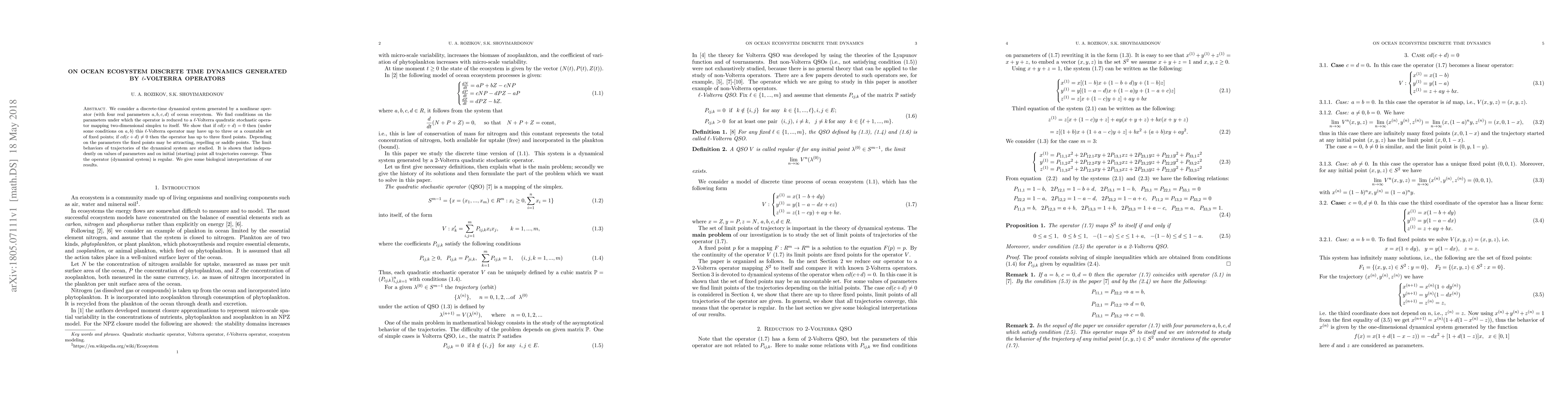 We consider a discrete-time dynamical system generated by a nonlinear operator (with four real parameters $a,b,c,d$) of ocean ecosystem. We find conditions on the parameters under which the operator is reduced to a $\ell$-Volterra quadratic stochastic operator mapping two-dimensional simplex to itself. We show that if $cd(c+d)=0$ then (under some conditions on $a,b$) this $\ell$-Volterra operator may have up to three or a countable set of fixed points; if $cd(c+d)\ne 0$ then the operator has up to three fixed points. Depending on the parameters the fixed points may be attracting, repelling or saddle points. The limit behaviors of trajectories of the dynamical system are studied. It is shown that independently on values of parameters and on initial (starting) point all trajectories converge. Thus the operator (dynamical system) is regular. We give some biological interpretations of our results.