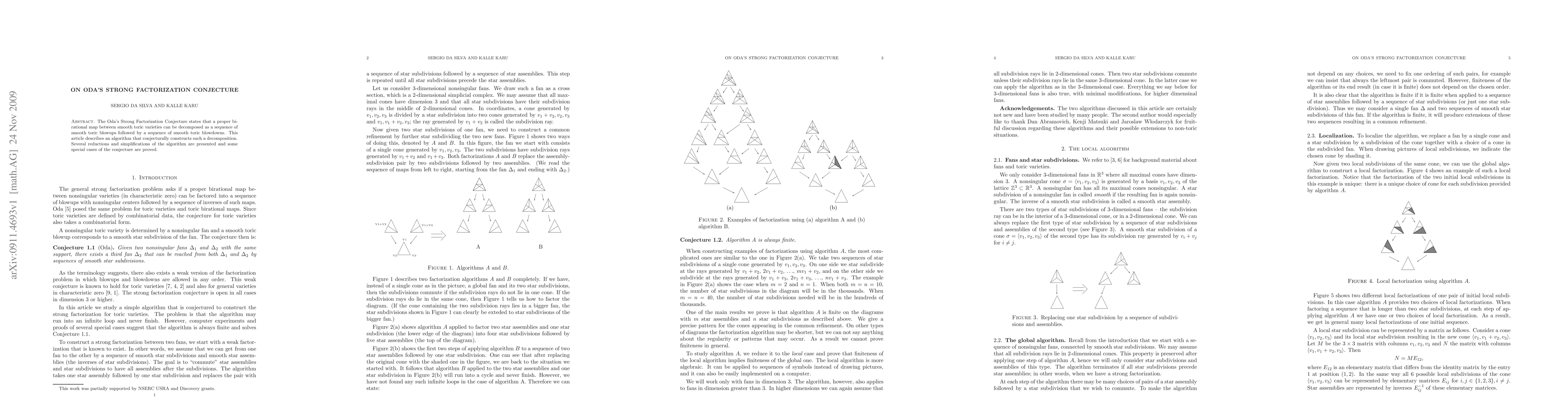 The Oda's Strong Factorization Conjecture states that a proper birational map between smooth toric varieties can be decomposed as a sequence of smooth toric blowups followed by a sequence of smooth toric blowdowns. This article describes an algorithm that conjecturally constructs such a decomposition. Several reductions and simplifications of the algorithm are presented and some special cases of the conjecture are proved.