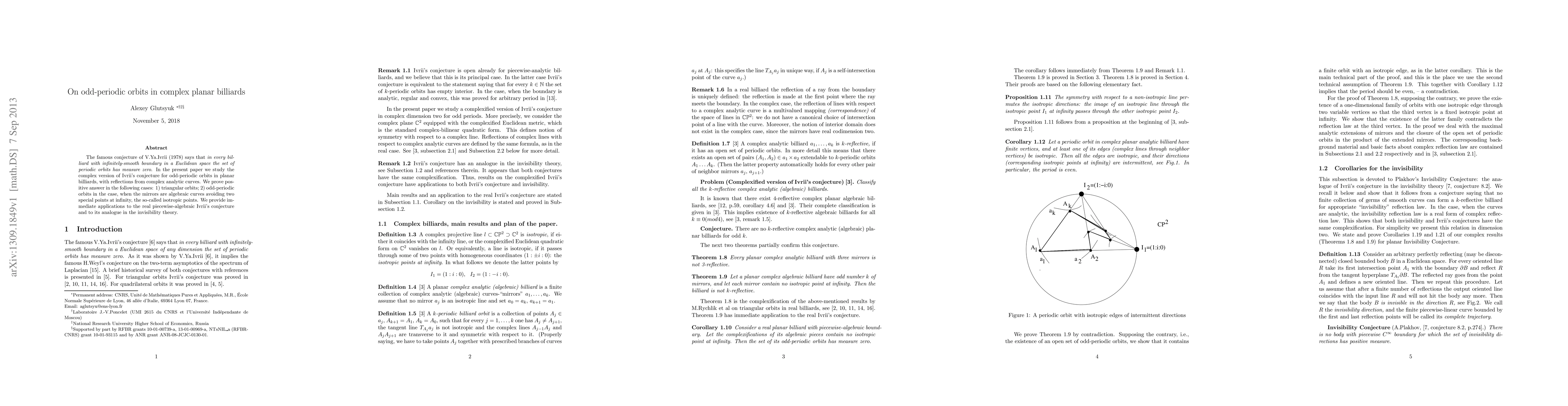 This paper confirms V.Ya.Ivrii's conjecture for odd-periodic orbits in complex planar billiards under specific conditions, proving it for triangular orbits and orbits with mirrors that avoid certain special points. It also extends the findings to real piecewise-algebraic settings and invisibility theory.