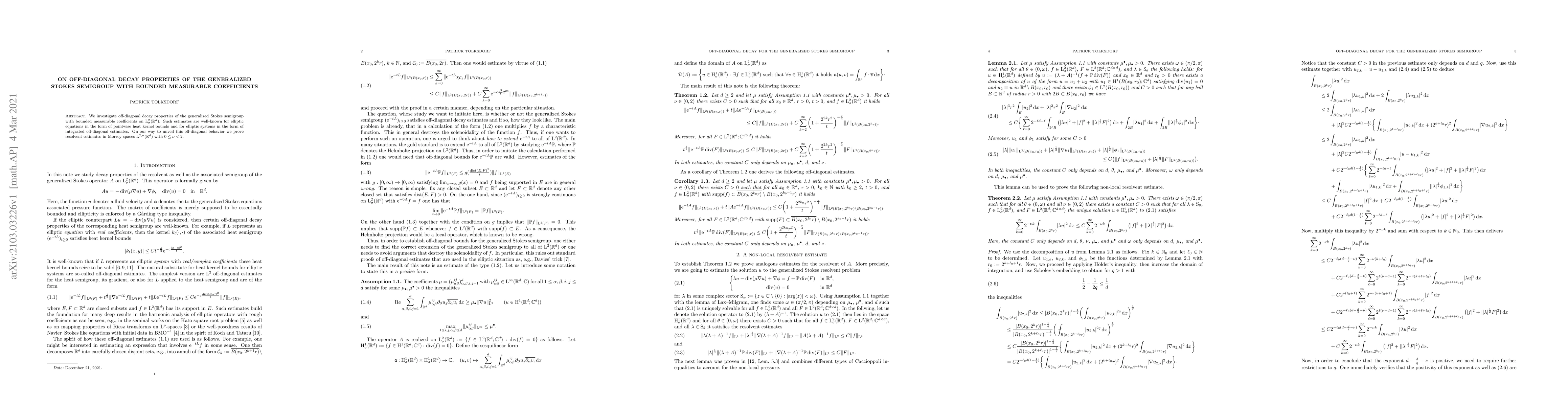 This paper studies the off-diagonal decay properties of the generalized Stokes semigroup with bounded measurable coefficients on $\mathrm{L}^2_{\sigma} (\mathbb{R}^d)$. The authors establish resolvent estimates in Morrey spaces $\mathrm{L}^{2 , \nu} (\mathbb{R}^d)$ to understand this off-diagonal behavior.