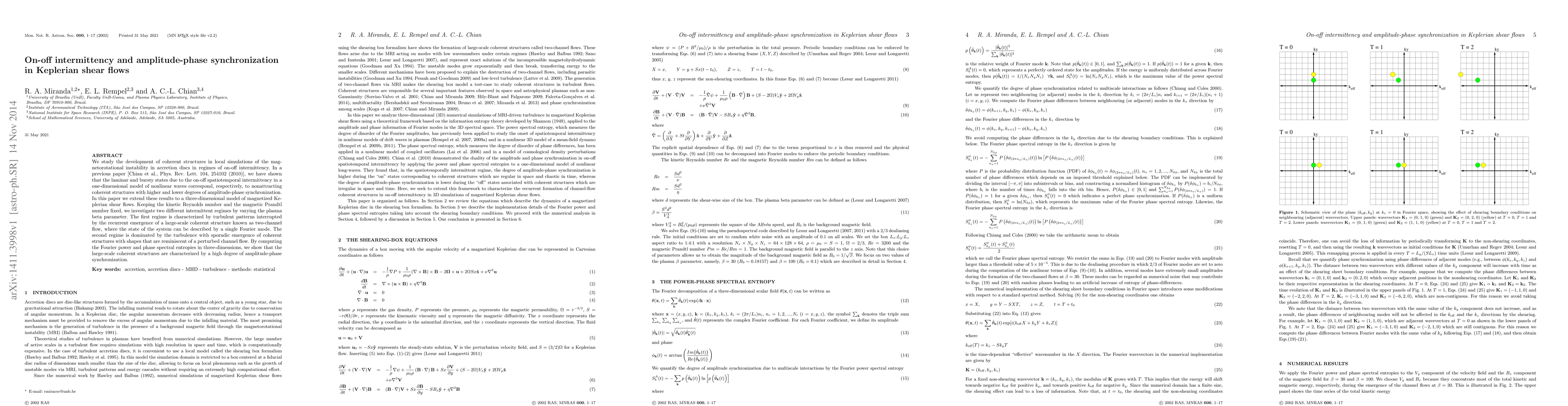 We study the development of coherent structures in local simulations of the magnetorotational instability in accretion discs in regimes of on-off intermittency. In a previous paper [Chian et al., Phys. Rev. Lett. 104, 254102 (2010)], we have shown that the laminar and bursty states due to the on-off spatiotemporal intermittency in a one-dimensional model of nonlinear waves correspond, respectively, to nonattracting coherent structures with higher and lower degrees of amplitude-phase synchronization. In this paper we extend these results to a three-dimensional model of magnetized Keplerian shear flows. Keeping the kinetic Reynolds number and the magnetic Prandtl number fixed, we investigate two different intermittent regimes by varying the plasma beta parameter. The first regime is characterized by turbulent patterns interrupted by the recurrent emergence of a large-scale coherent structure known as two-channel flow, where the state of the system can be described by a single Fourier mode. The second regime is dominated by the turbulence with sporadic emergence of coherent structures with shapes that are reminiscent of a perturbed channel flow. By computing the Fourier power and phase spectral entropies in three-dimensions, we show that the large-scale coherent structures are characterized by a high degree of amplitude-phase synchronization.