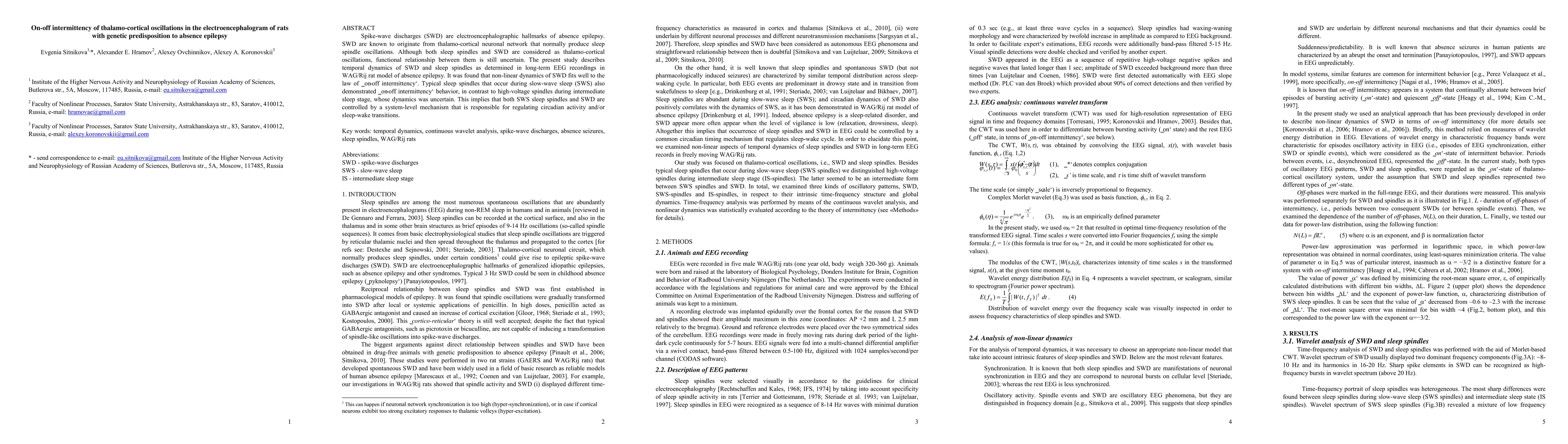 This study investigates the temporal dynamics of spike-wave discharges (SWD) and sleep spindles in the EEG of WAG/Rij rats, finding both exhibit 'on-off intermittency'. This suggests a common regulatory mechanism for both SWD and slow-wave sleep spindles, potentially linked to circadian activity or sleep-wake transitions.