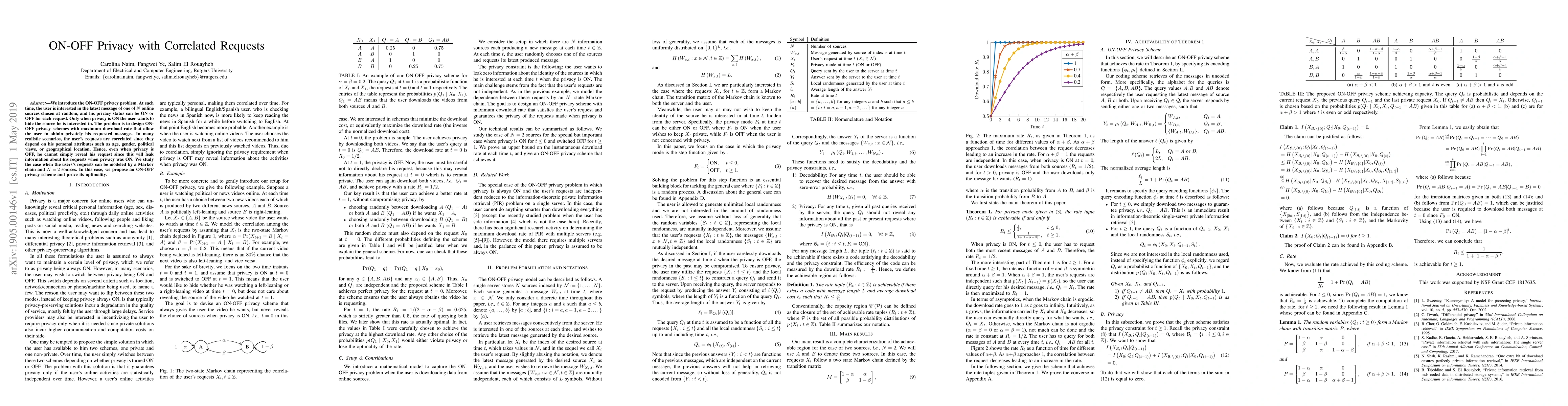 This paper introduces the ON-OFF privacy problem where users request messages from online sources with privacy statuses that can switch between ON and OFF, aiming to maximize download rates while ensuring privacy. The authors propose an optimal ON-OFF privacy scheme for scenarios where users' requests are correlated and modeled by a Markov chain, demonstrating its effectiveness for two sources.