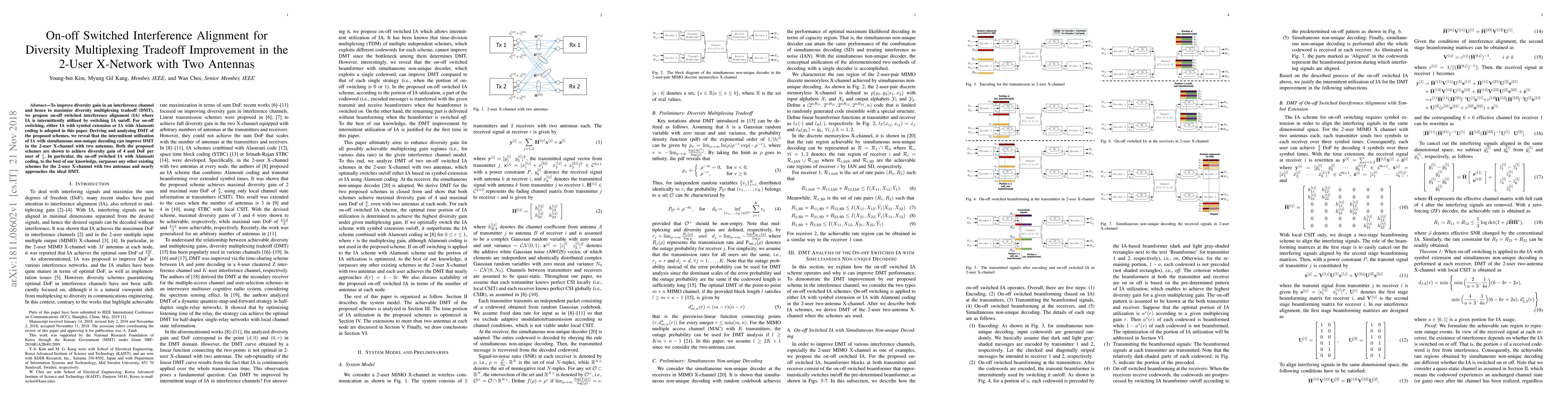 To improve diversity gain in an interference channel and hence to maximize diversity multiplexing tradeoff (DMT), we propose on-off switched interference alignment (IA) where IA is intermittently utilized by switching IA on/off. For on-off switching, either IA with symbol extension or IA with Alamouti coding is adopted in this paper. Deriving and analyzing DMT of the proposed schemes, we reveal that the intermittent utilization of IA with simultaneous non-unique decoding can improve DMT in the 2-user X-channel with two antennas. Both the proposed schemes are shown to achieve diversity gain of 4 and DoF per user of $\frac{4}{3}$. In particular, the on-off switched IA with Alamouti coding, to the best of our knowledge, surpasses any other existing schemes for the 2-user X-channel with two antennas and nearly approaches the ideal DMT.
