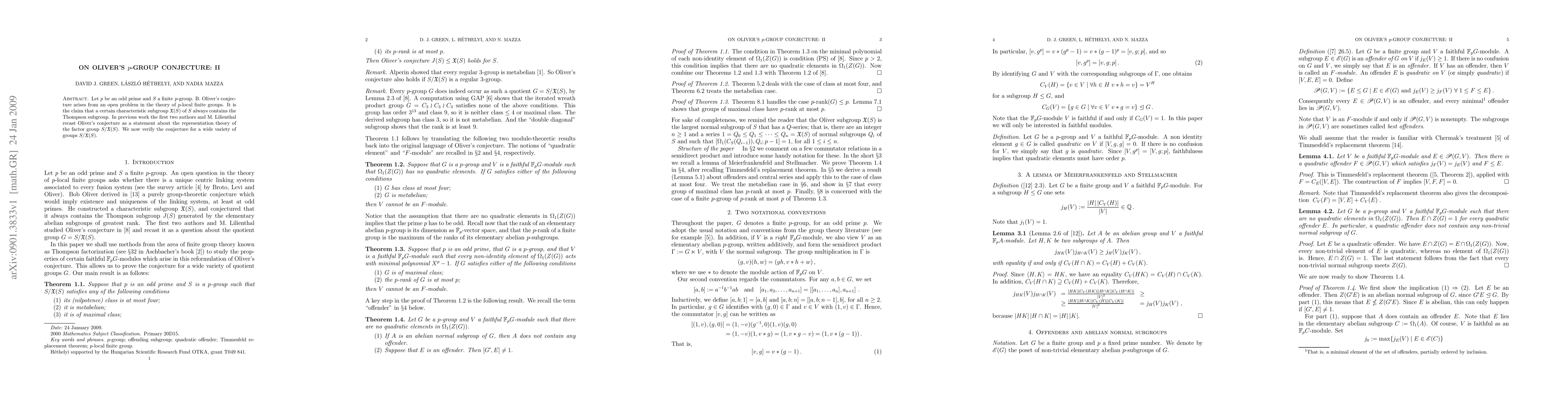 Let p be an odd prime and S a finite p-group. B. Oliver's conjecture arises from an open problem in the theory of p-local finite groups. It is the claim that a certain characteristic subgroup X(S) of S always contains the Thompson subgroup. In previous work the first two authors and M. Lilienthal recast Oliver's conjecture as a statement about the representation theory of the factor group S/X(S). We now verify the conjecture for a wide variety of groups S/X(S).