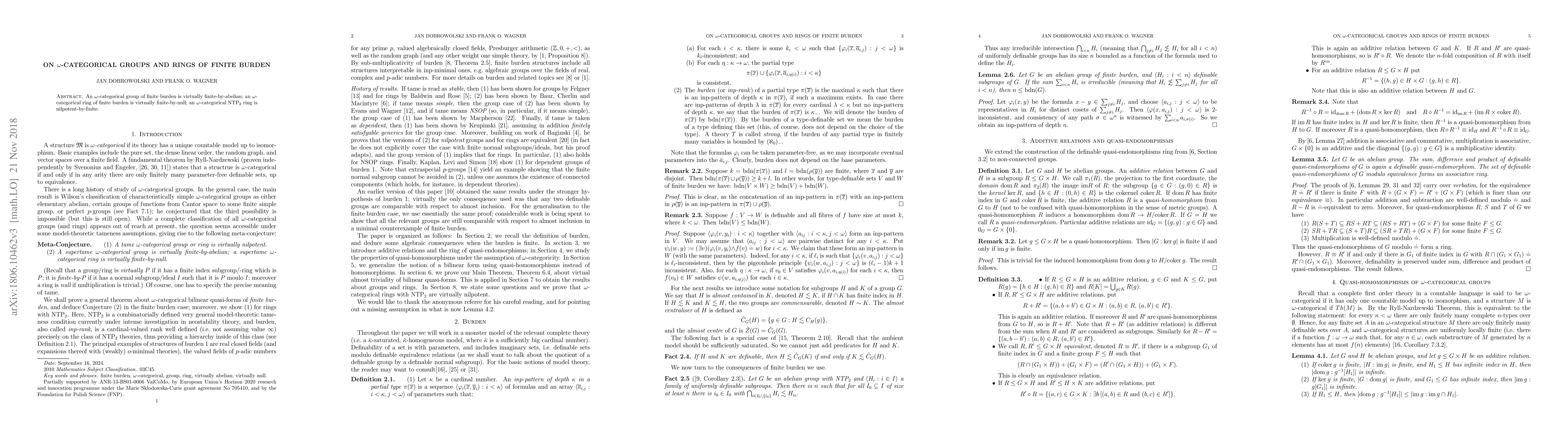 An $\omega$-categorical group of finite burden is virtually finite-by-abelian; an $\omega$-categorical ring of finite burden is virtually finite-by-null; an $\omega$-categorical NTP2 ring is virtually nilpotent.